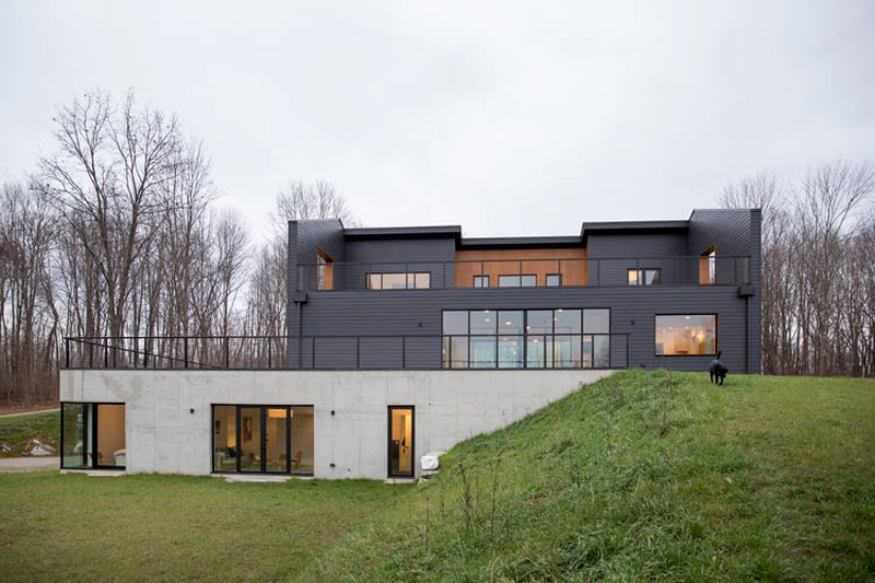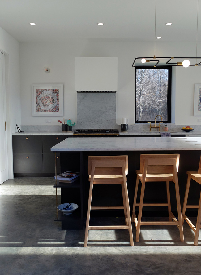 I was excited to spot a new project among the portfolio of one of my favourite architecture & design firms Studio DB. Turns out it is the 3,500 sq ft Amenia, NY weekend home of principals Damian and Britt Zunino. (Pretty sweet for a weekend home!) I adore everything about this house – the blue framed entryway, all of the light fixtures, the curve of the kitchen backsplash, the openness to the outdoors, the Ellie Cahsman floral wallpaper, the marble hex tiles inset around the bathtub…and on and on and on…(Photos: Preston Schlebusch)