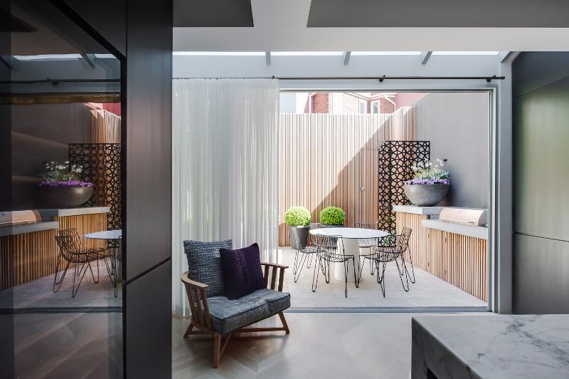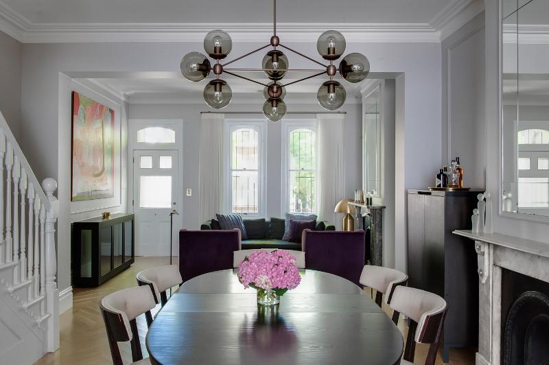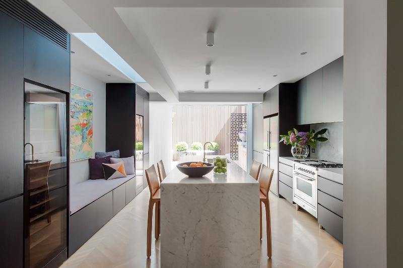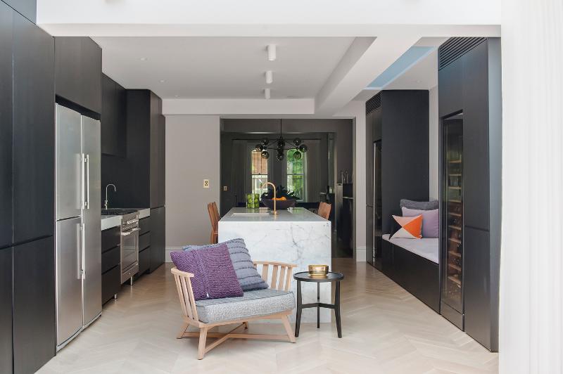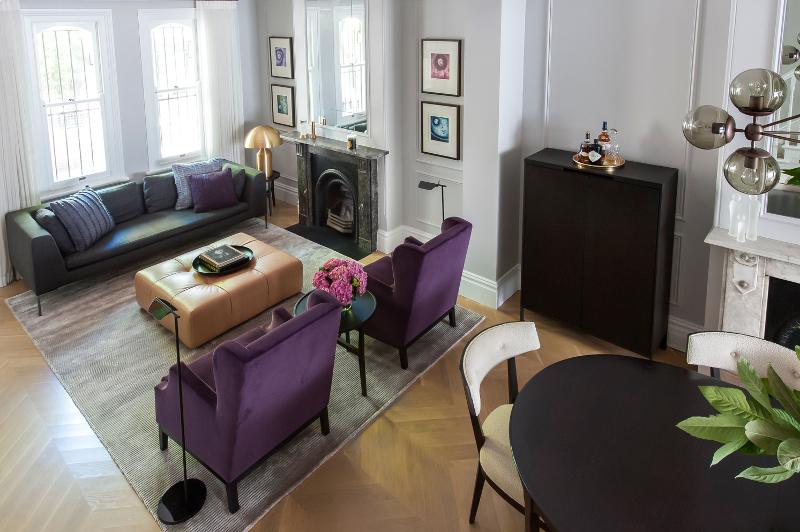 Sydney terrace house renovation given the luxury touch with bespoke cabinetry, chevron oak floors and marble, Rich purple velvet plays against caramel leather and gold metallic highlights. Darlinghurst Terrace by Tonka Andjelkovic Design.