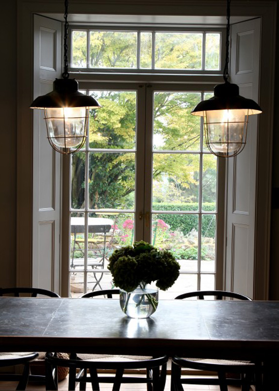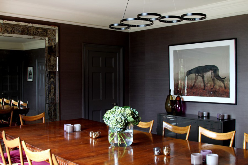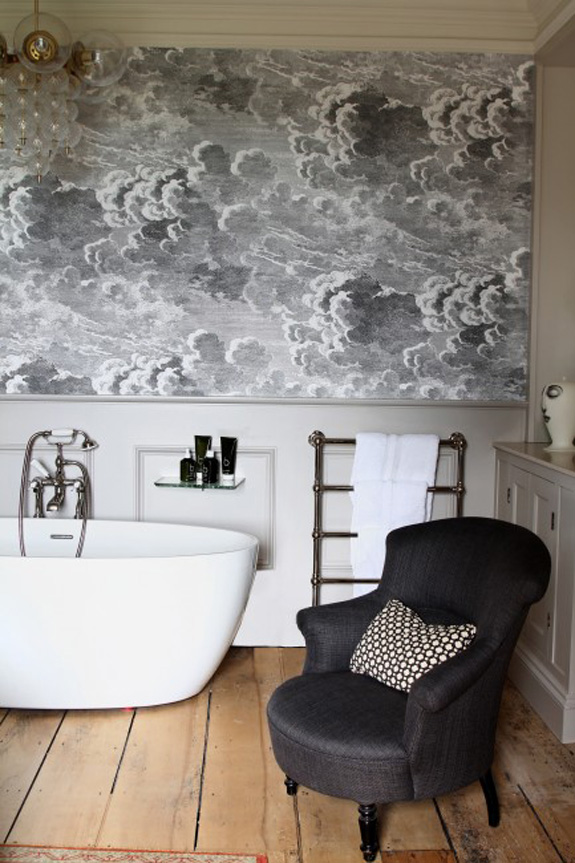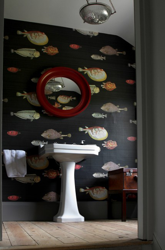 This Georgian country home in West Sussex, U.K. is stunning inside and out. Interior designer Caroline Riddell brought together several styles merging past and present and the result is elegant and quite charming. I love the fishy wallpaper!