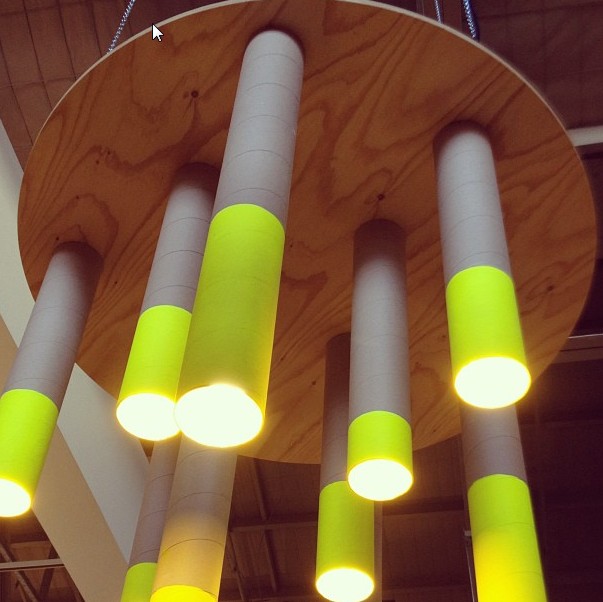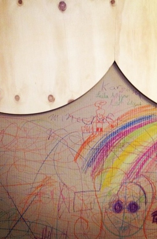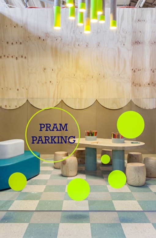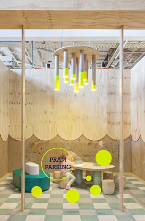Not much space (16m2). Very little money. Brillant solution. A dedicated children’s play room which sits next to a cafe in a shopping centre. The scalloped plywood walls hold replacable cardboard sheets for scribbling while the cardboard tube light has been dip painted fluoro yellow for maximum impact. Great inspiration for a domestic playroom. Playspace by Clare Cousins Architects.