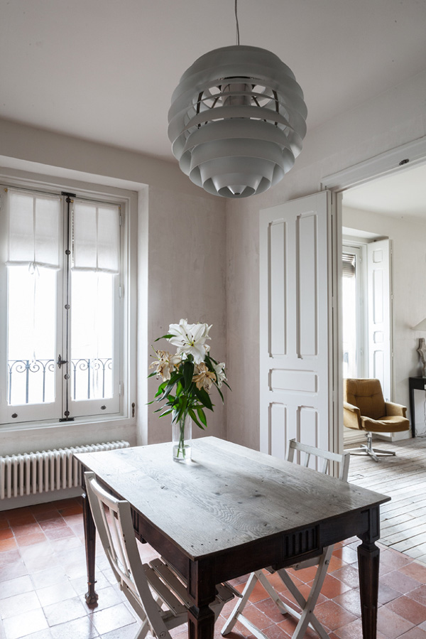 A beautiful multilevel loft in a converted workshop in the heart of Montmartre. Large windows overlook the courtyard garden while allowing light to stream into the space. White walls play off old oak floors and the level changes accommodate bedroom, living and kitchen dining areas. The industrial look of the old building is retained but modernised. This project was realised in 2008 and the photos appear to show its early stage occupation, a little stark, a little empty, missing the personal touches. I would love to see it 7 years on as its owners have settled in and imprinted their lives on its old walls. Loft à Montmartre by Delphine Martin-Michaud of 2DESIGN.