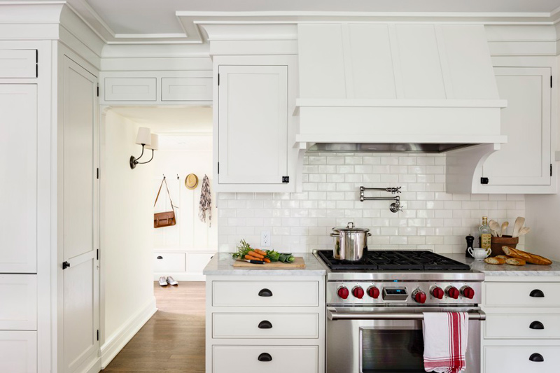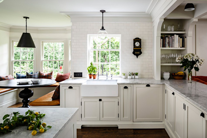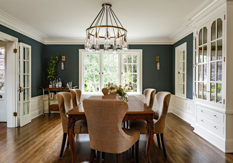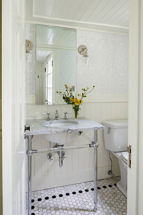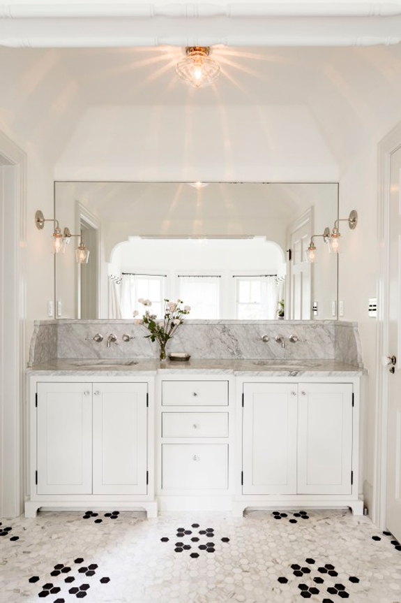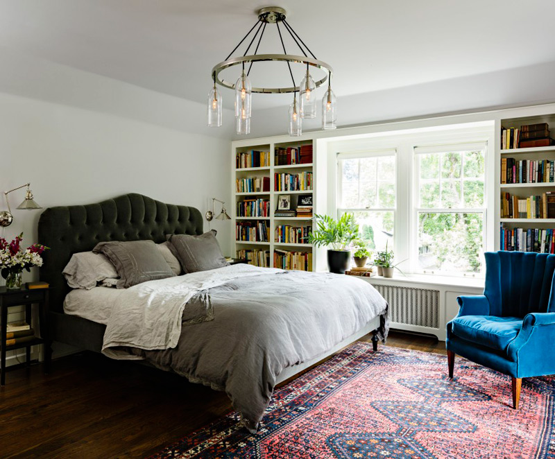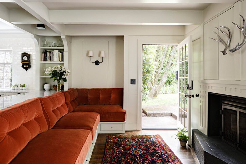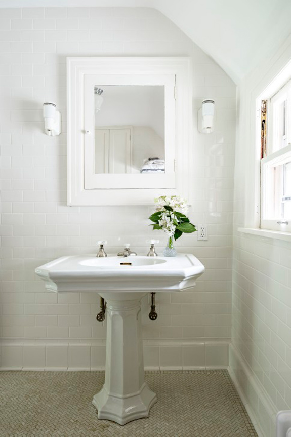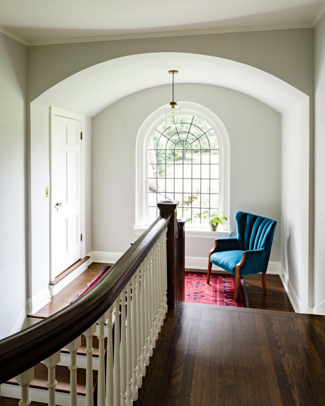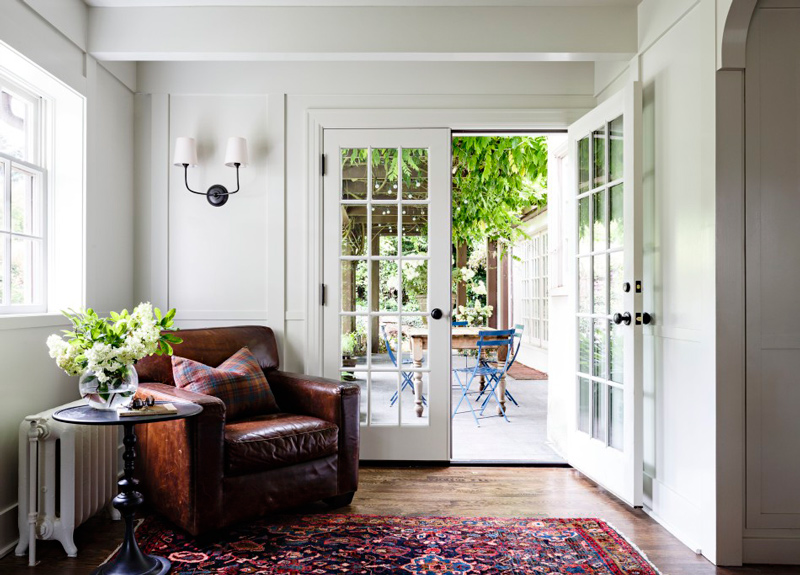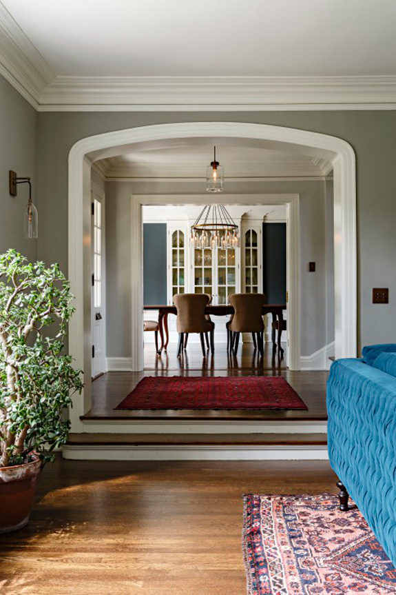 We have showcased Jessica Helgerson‘s work here on DTI numerous times because her spaces are perfection. And here is yet another example of her skill with a tudor style home designed with more traditional decor and while I typically prefer a more mid-century vibe, I still love every inch. Unfortunately by the time our clients bought the house it had suffered several poor remodels and had fallen into disrepair. Our challenge was to retain the character and charm of the house, while fixing the things that had gone wrong and reworking the layout to create rooms for a modern family that enjoys cooking, eating, and being together. We completely renovated the kitchen, taking out a wall to transform it from a narrow galley into a spacious room with a breakfast nook and a generous island. The kitchen is open to an adjacent “snug room” with comfortable built-in seating, a fireplace, and a television concealed behind a paneled wall. In the living room, we designed two L-shaped sofas to create a simple and inviting furniture layout, which centers around a generous coffee table and fireplace. Our design for the coffee table was inspired by the hexagonal marquetry top on the clients’ heirloom dining table, which we kept and reused. On the second level, we reconfigured a convoluted closet and a tiny master bath to make space for a generous master bath, a laundry room and a large walk-in master closet. We also remodeled two more existing bathrooms, designing a custom mosaic tile pattern for each. We also designed custom light fixtures, as well as a new built-in dining cabinet with glass doors. (Photos: Lincoln Barbour)