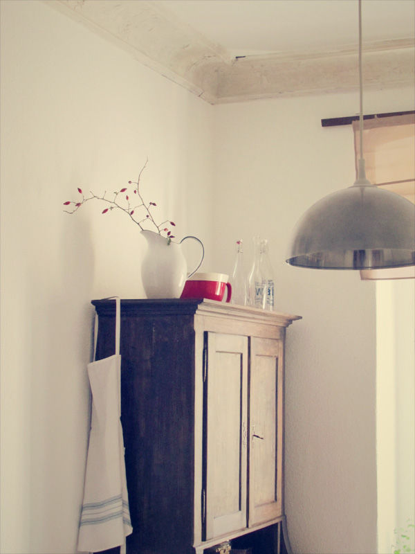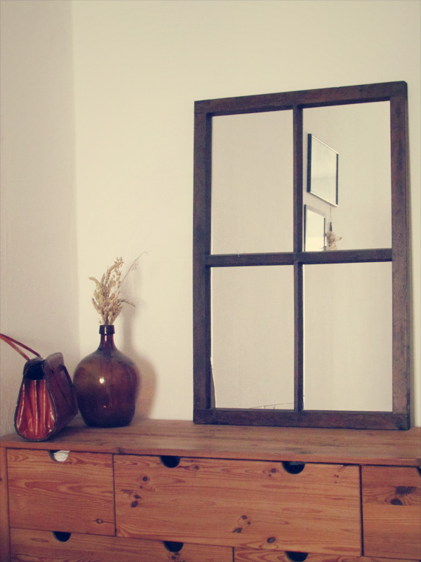 The bathroom was the only thing that was recently renovated by the houseowner. All other rooms had bare ceilings and walls which I washed because no wallpaper would stick to them and linoleum floors which were broken or crumbly. The old floor boards in the living room where sanded (with machines and on my knees) and then painted with a special varnish. The walls were then painted white because it is still a rented flat and one day I will have to give it back… It took me 3 weeks to remove the old paint from the stucco in the kitchen. There where 5 layers of paint and you could barely see any details. The bed was build by my friend Thomas (my birthdays present ;-), also the coffee table/cable reel in the living room. The mirror in the bedroom is an old window from a farmhouse. The sideboard in the hallway is my great grandmothers, my grandparents had no place for it. Also the brown wardrobe in the living room, where I store my fabric for sewing. The sideboard in the bathroom was built by me – it was the first thing I built alone and that’s why it is a little wobbly 🙂