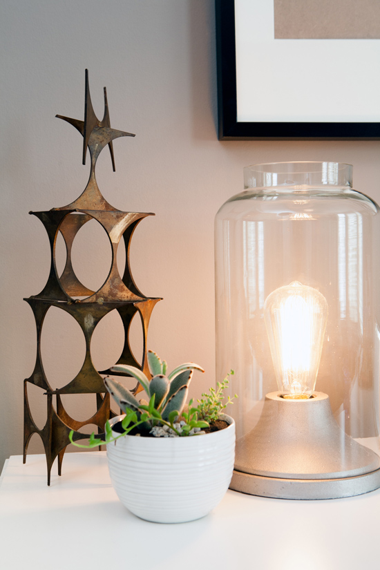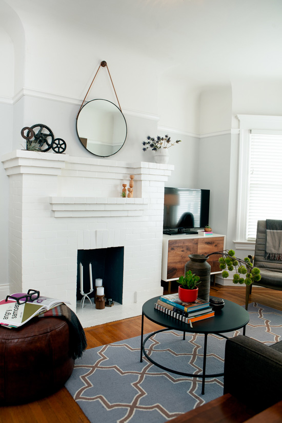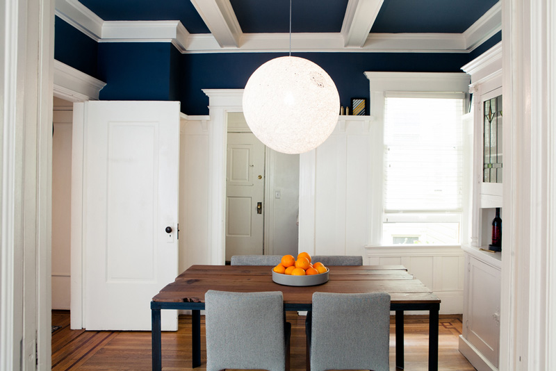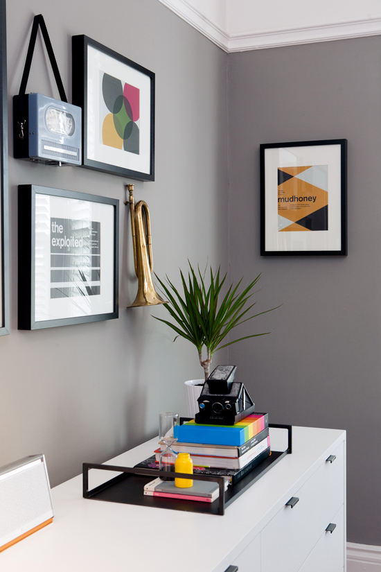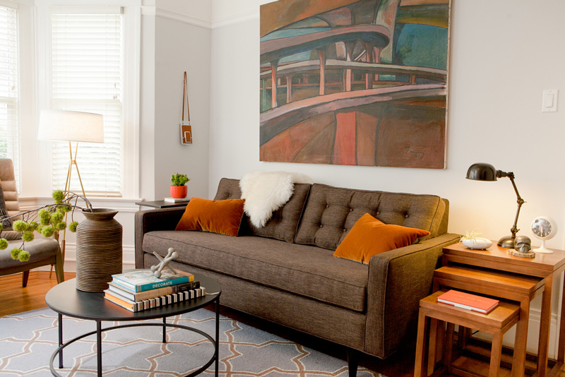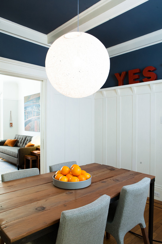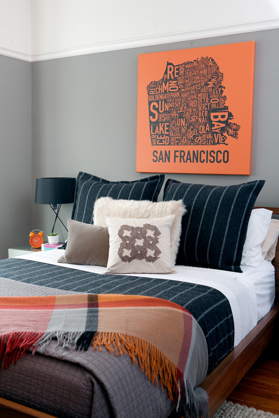 This modern bachelor pad designed by San Francisco interior designer Regan Baker really hits all the right notes. Love the lightest and the touches of orange and blue throughout, and it is not too masculine. The overall color pallet was derived from his uncle’s large scale highway artwork, which is now displayed proudly above the custom sofa. From there we built the design around his love for modern spaces, his personal hobby of photography and his love for music. With the exception of a few great pieces of art, we worked hand in hand with our client to assure his bachelor pad was masculine, yet casual modern and in the end created a bachelor pad Ryan Gosling would be happy to bring his dates back to. (More of her work here)