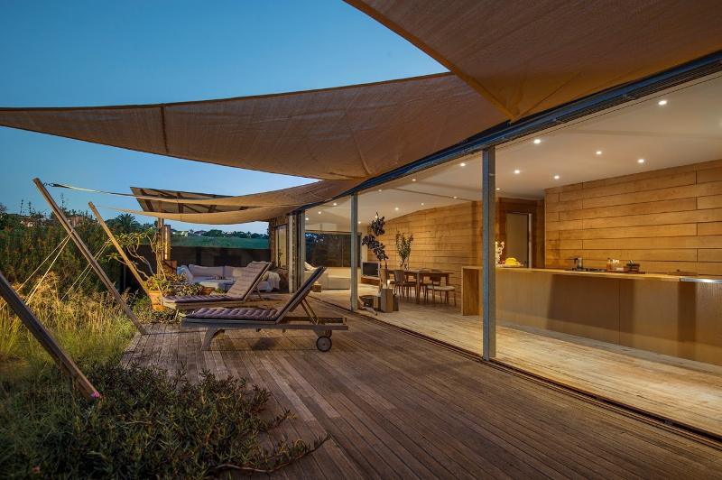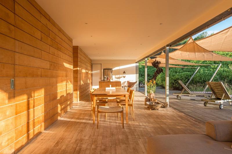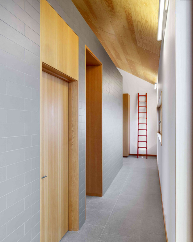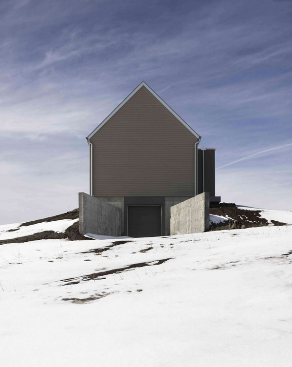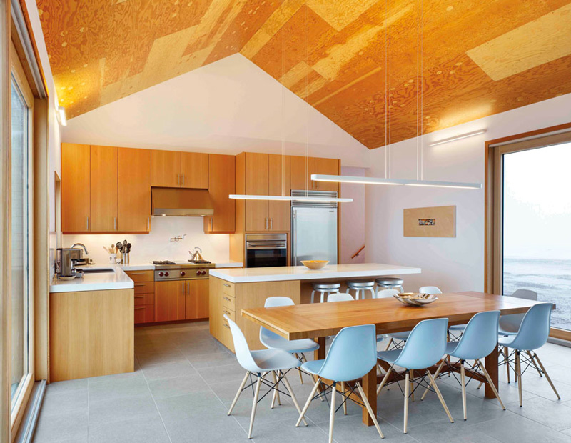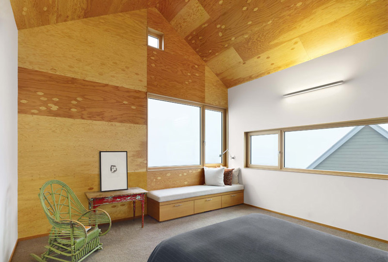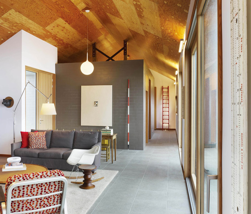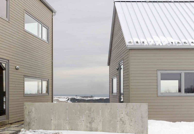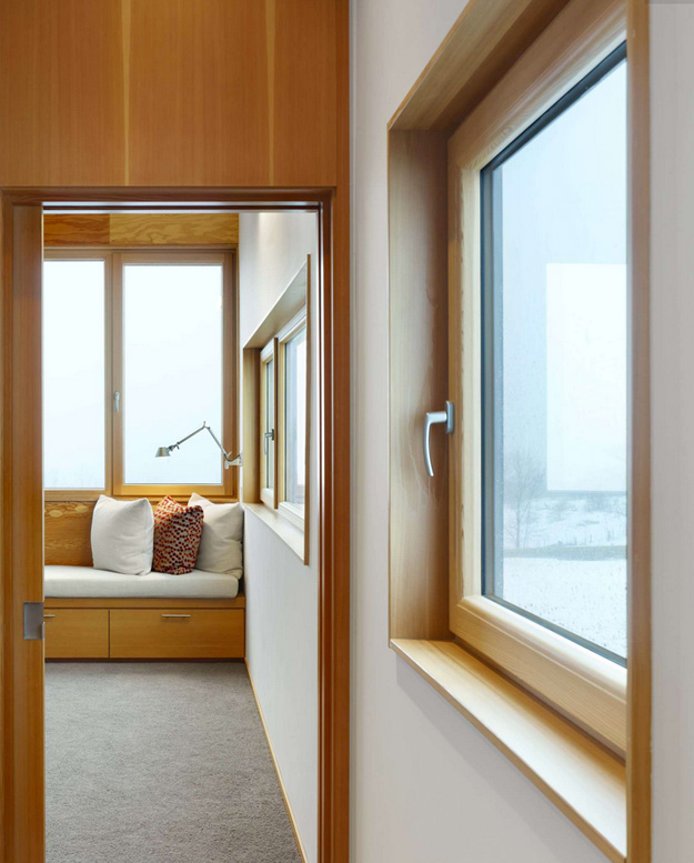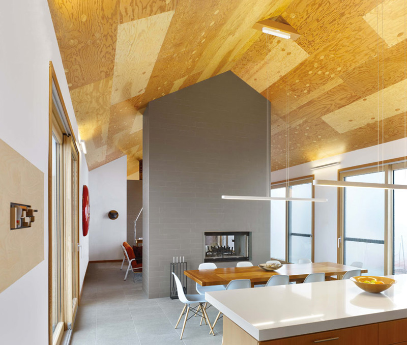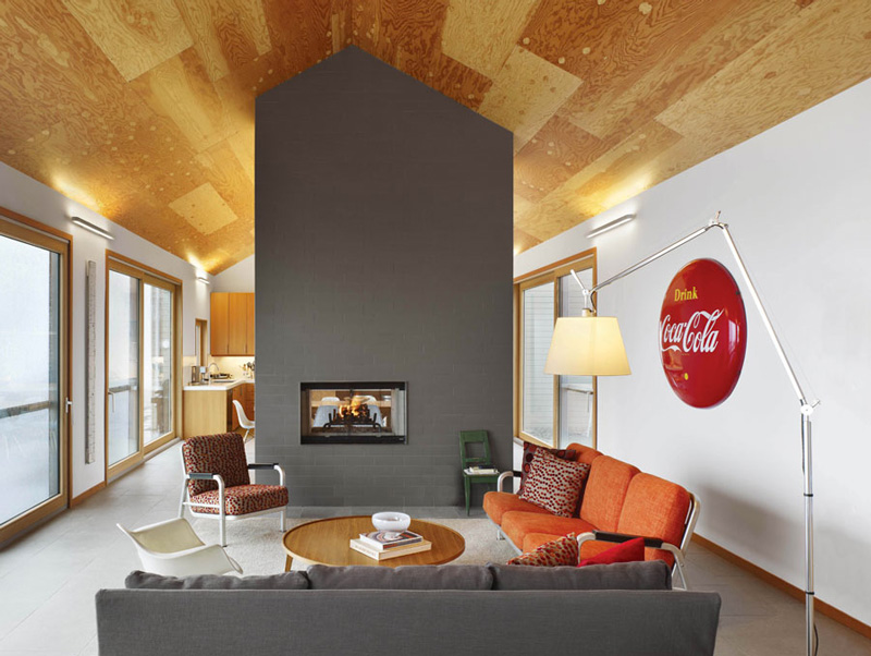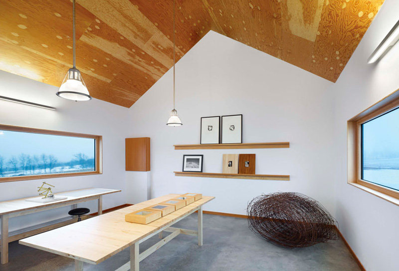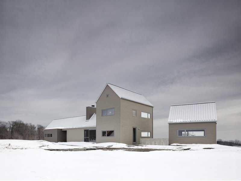On 100 acres with a view of Lake Ontario sits The Farm. Architect Cindy Renderly‘s clients wanted something modern but appropriate for the country. A gabled roof line is in keeping with a typical barn structure, but inside it’s minimalist and not-so-farm-like. Cindy used Douglas fir plywood on the ceilings to add warmth, and it’s a beautiful choice. An artist’s studio is an added bonus, separated from the main house by a courtyard. Despite being a tad bleak looking in the winter, this must be such a peaceful retreat, especially in summer.
