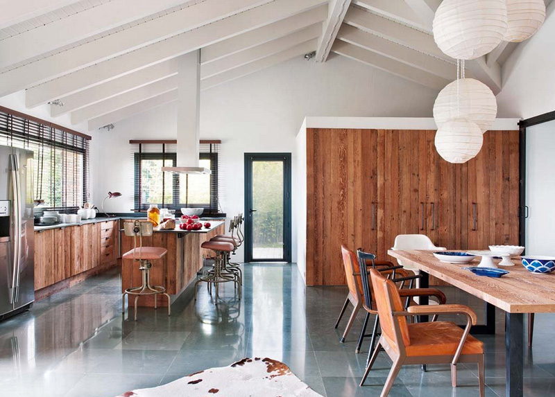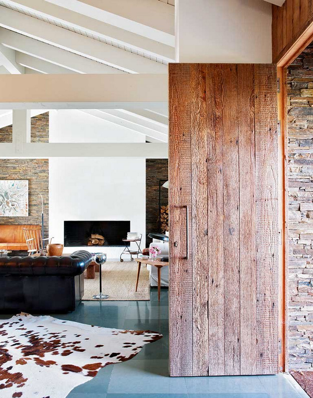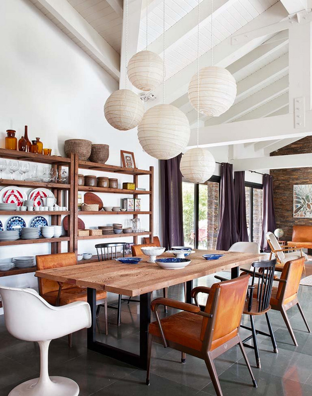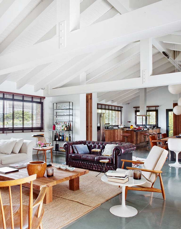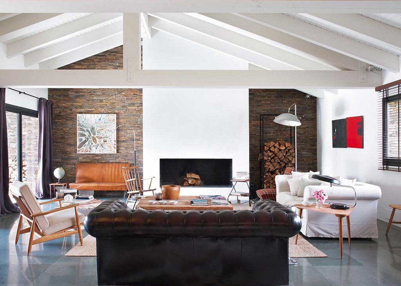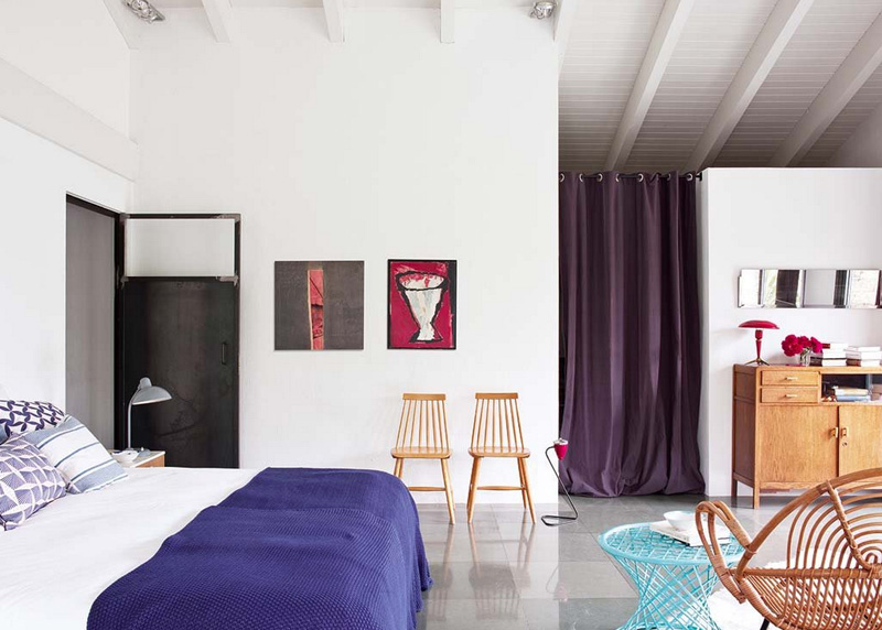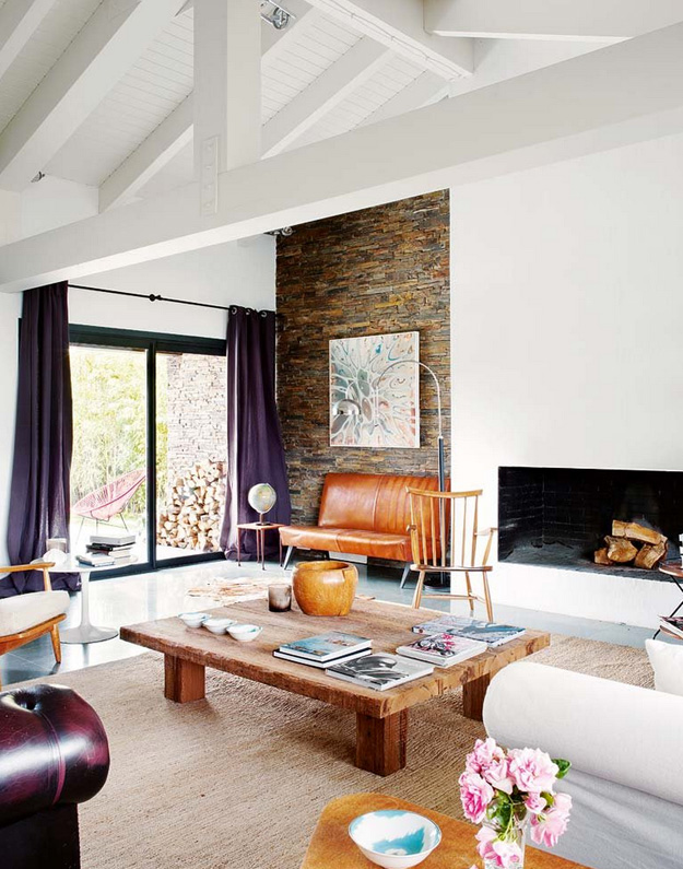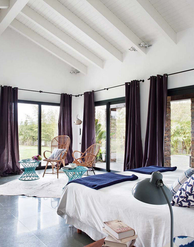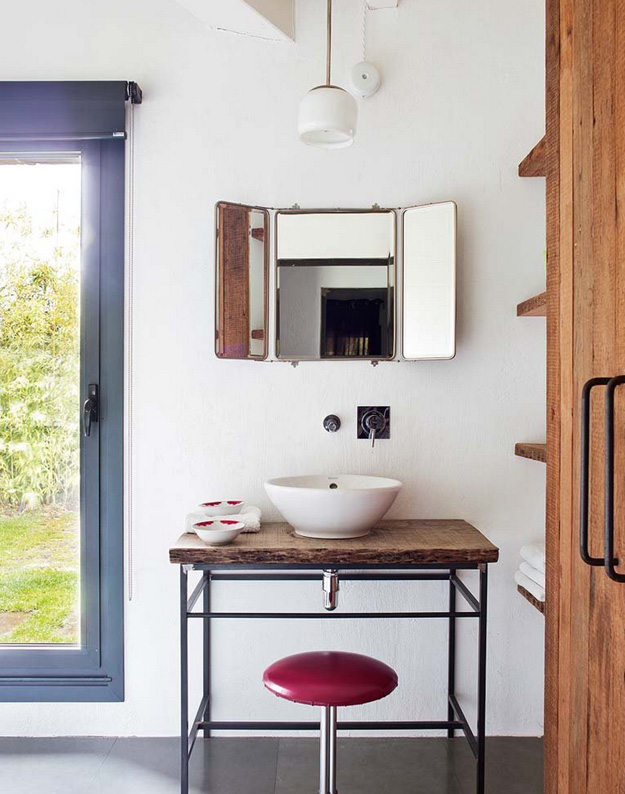 I fell in love/hate with this cottage/home in Spain featured in a recent issue of Nuevo Estilo. It’s huge open layout is perfect for cottage life and would be a fantastic gathering space of lots of friends and family. The combination of rustic (reclaimed wood, stone) mixed with a leather chesterfield and plaid chair also joined with some mid-century chairs and tables – bringing such disparate pieces together really works here. However, I am baffled by all of the window treatments – massively long purple curtains (why purple? WHY??) and blinds hung way too high. AGH!! The one red, one silver light fixtures in the bathroom…bad idea. (I won’t even discuss the bedding). And it is disappointing to see such a lazy approach to the ceiling and beams. Spraying it ALL white instead of leaving some of the raw wood showing, or at least the steal pieces. (Designed by Kotablue and Mercedes de las Heras)