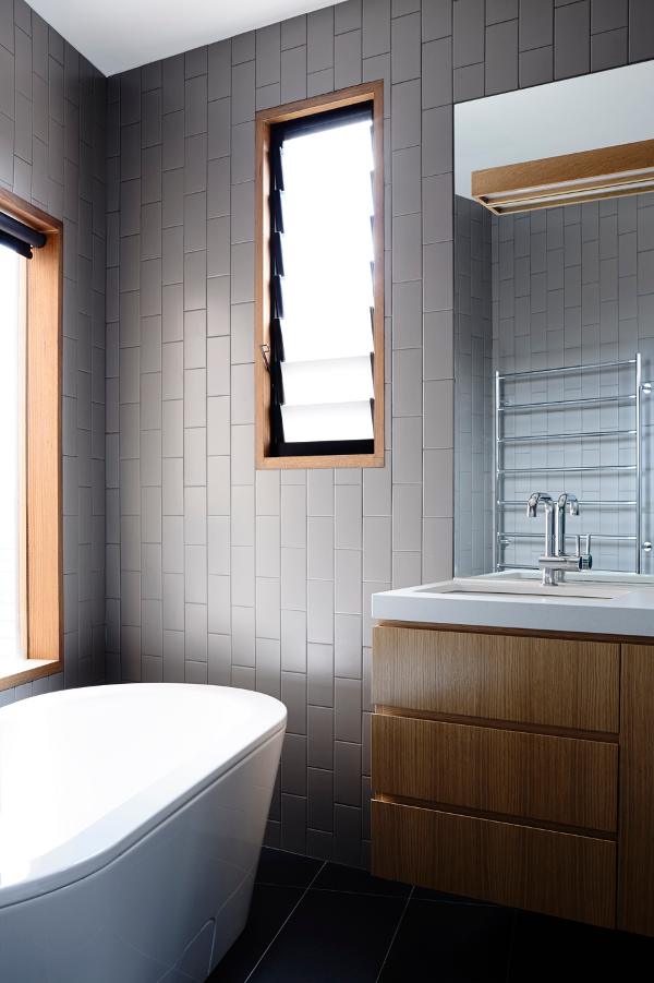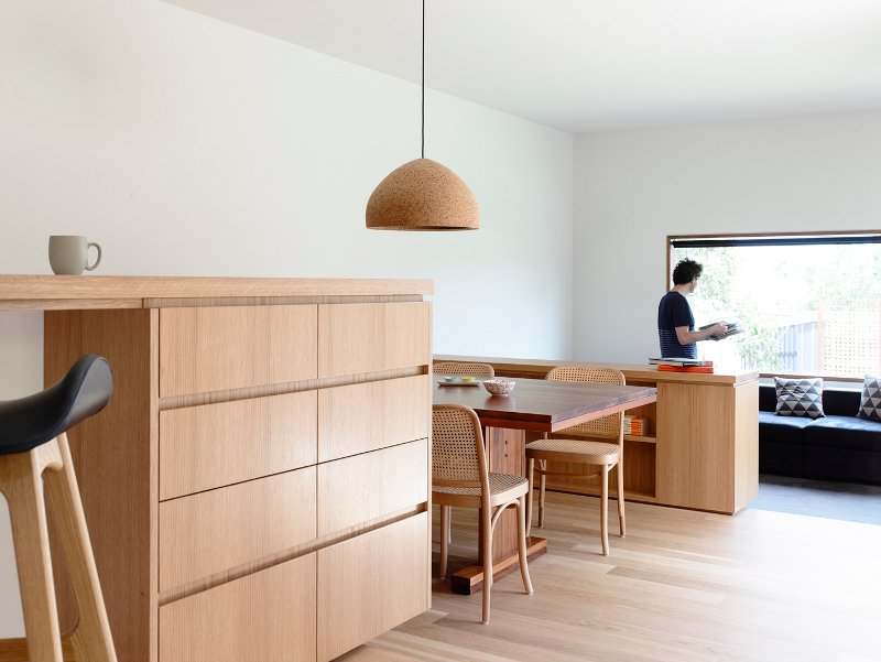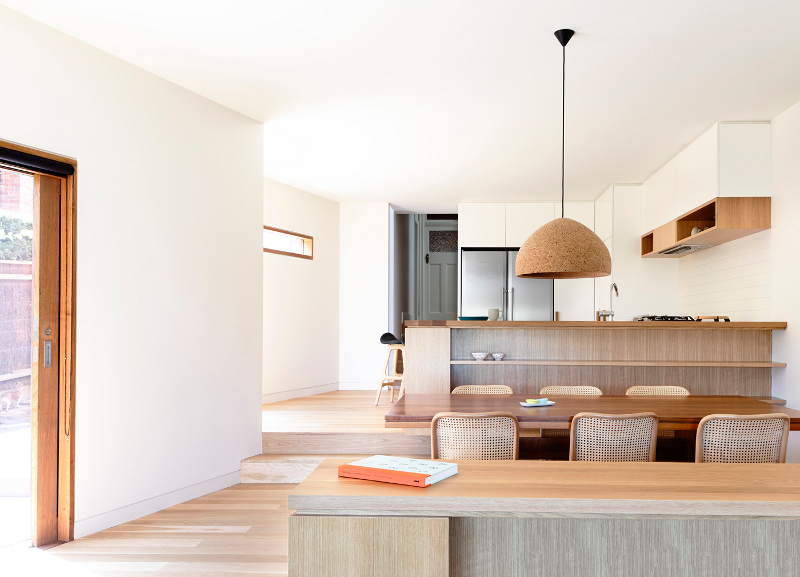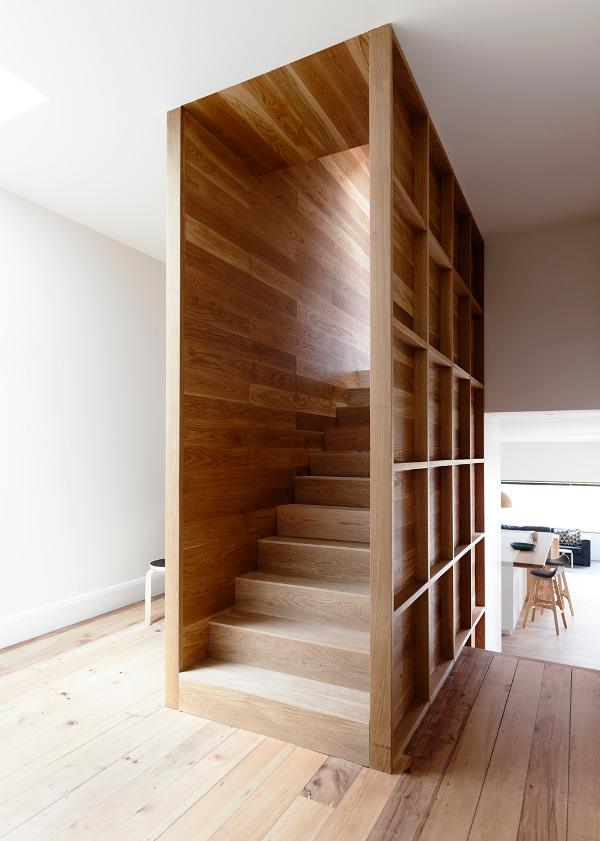Stepping down a sloping site in Kew, Melbourne is this extension containing kitchen, dining and living rooms with master bedroom suite above. In the transition space between the old Edwardian house and the new is the staircase, with exposed oak framing, providing areas for display in the nearby study nook and adjacent hallway. Stepped House by Rob Kennon Architects.