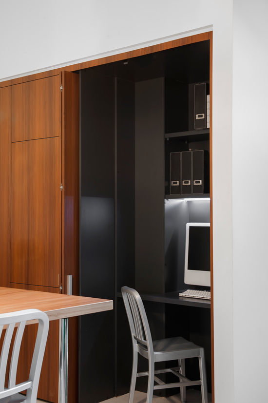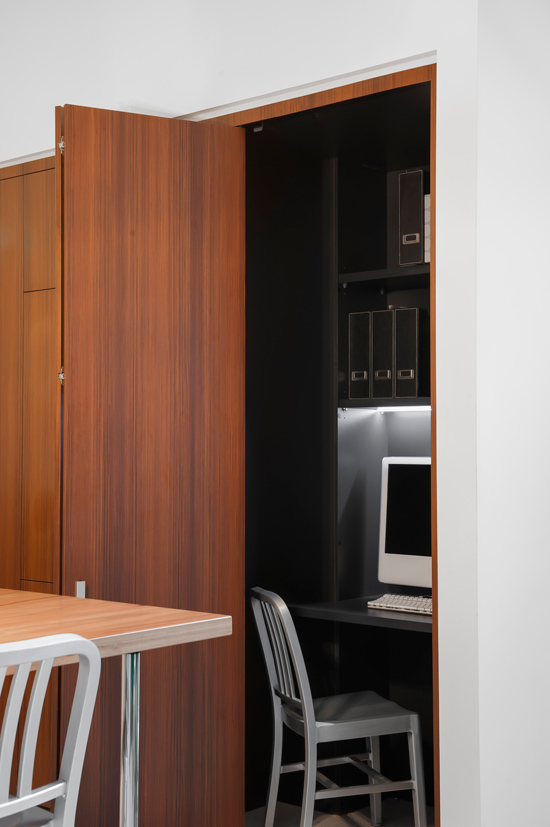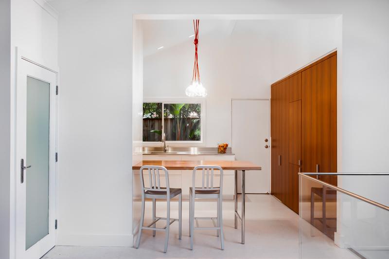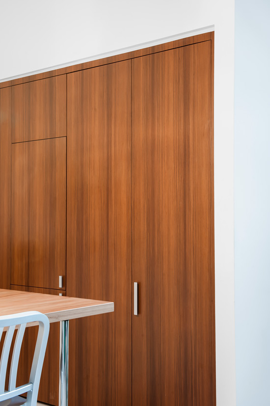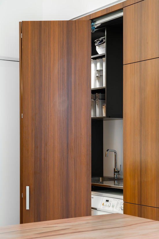 The designer chose to place the tall run of joinery items under the existing bulkhead (carpenters had recently commenced renos). This was the first thing on view when entering the terrace. These full height doors house the laundry nook, home office (behind pocket bi-folding doors) & integrated refrigerator.