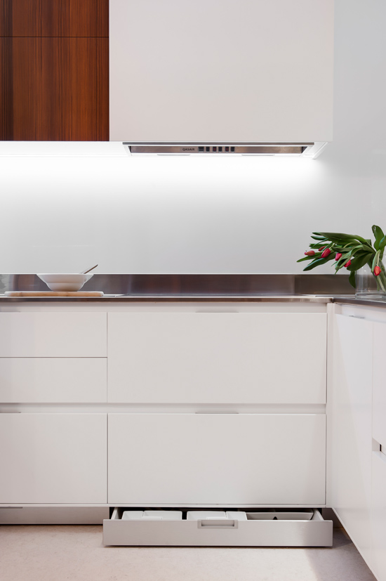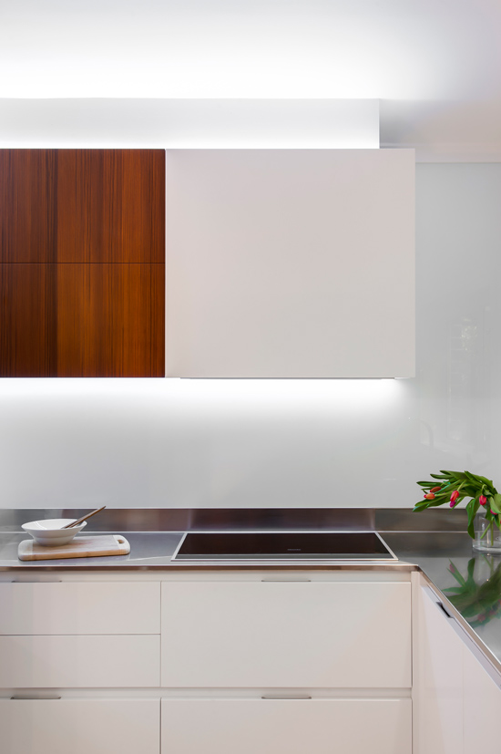 Thanks to Minosa Design for sharing with us yet another impressive project. This time it’s a kitchen that is high on style yet low on space. The brief: To create a clean & modern kitchen one that catered to modern living requirements. The space had to integrate a home office & laundry as well as an everyday eating area for at least two. As far as layout goes there really was not a lot of flexibility with the footprint of the kitchen, it could not be changed or relocated. It was a matter of making use of the available space and organising the zones so they would function efficiently for this family.