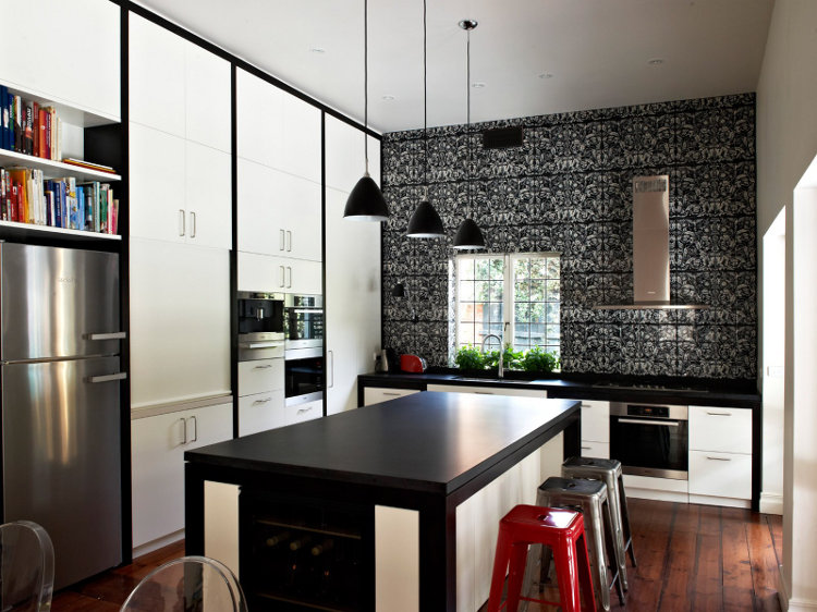 Stylish and bold. Practical and contemporary. Arts and Crafts house and modern kitchen. Graphic and sleek. Simplified joinery against old wooden floors. Black and white. Flash of scarlet. Love it. Kitchen by Melbourne interior designers Nexus.