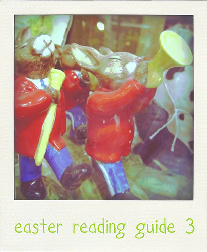 Oh dear me! Unbutton my jeans. I have had a little TOO much chocolate (and hot cross buns). My kitchen painting is rambling along. I realise now why professionals get paid good money to paint walls. But now I’ve started I’ll struggle on. You can have a laugh at how pitifully inadequate my painting skills are on my page but if you’re sensible you’ll ignore my painting adventures and instead head off to visit new blogs. Here is the third installment of our Easter reading guide. Enjoy!