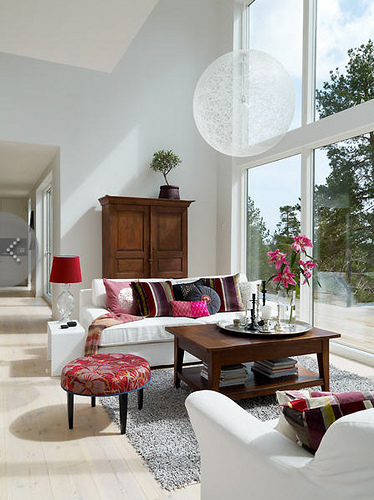 Not hard to see why Mikael Beckman is one of Sweden’s leading stylists. It’s great to see a masculine take on the Swedish vibe but still the core ingrtedients are there – white, bright, comfortable and stylish, a touch of vintage, lashings of midcentury classic pieces, an easy confidence. How about that red kitchen? Not for the shrinking violets! Love the recessed display with lighting. Might have to steal that idea.