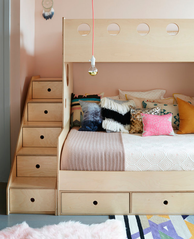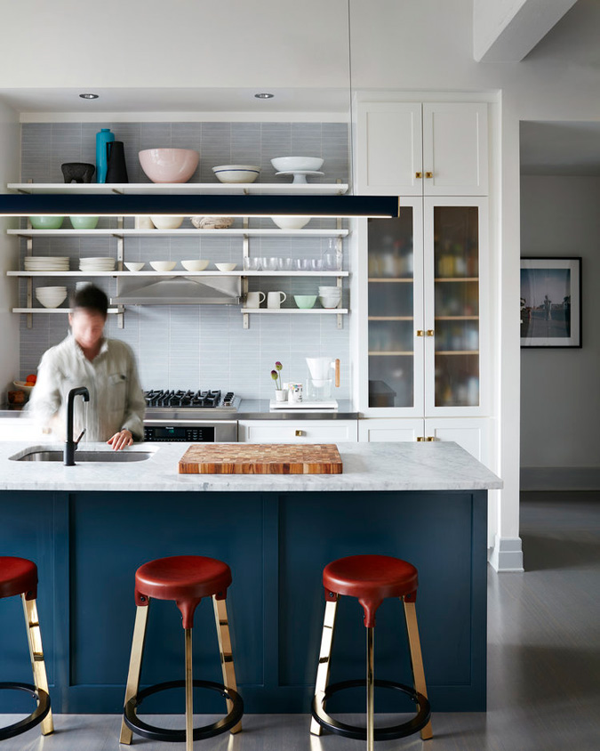 Low ceilings, beige wall-to-wall carpet, plain doors, ugly windows, a grim kitchen….living in a rental isn’t easy but designer Ashley Hicks certainly worked magic with his rental apartment. Graphic paint treatment on the walls, a photo transparency covering an ugly window, upholstery nails fancying up doors, paint details on cheap linen roller blinds, pendant lights made from copper and black paint, a handmade screen using a map of London to hide another ugly window, red vinyl and striped webbing used to spruce up a hallway, and the list goes on. Ashley may have spent a ton of time and energy transforming his apartment and customizing every square inch but the result is incredibly unique and dynamic and clearly well worth it.