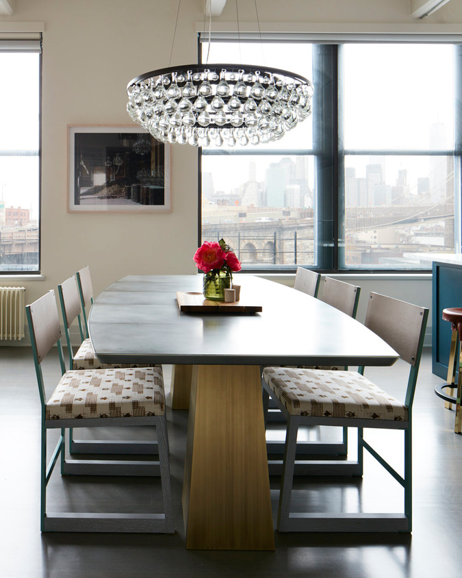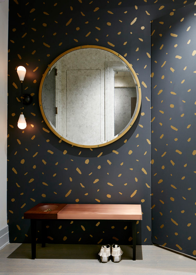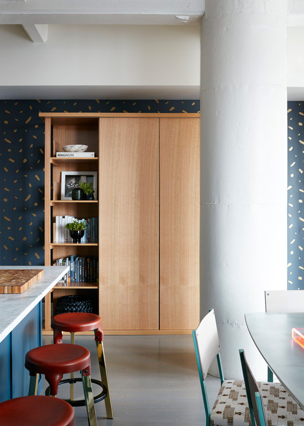 I am not super happy with my pale pink dining room walls. I had considered wallpaper but thought since my foyer that leads into the dining room is wallpapered that it would be too much pattern. Now I am regretting not going for it. This Dumbo, Brooklyn loft designed by Current Interiors has 3 different wallpapers happening and I think it looks fantastic!