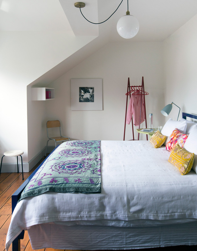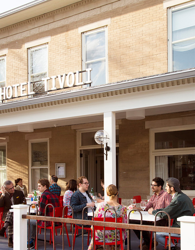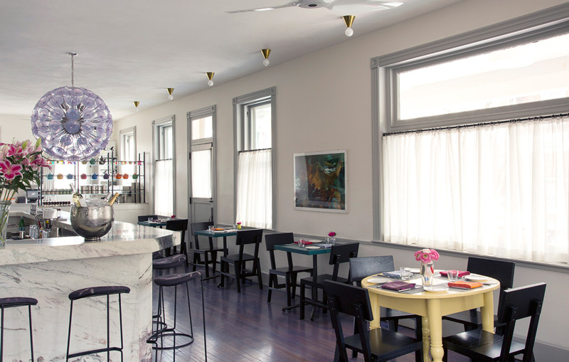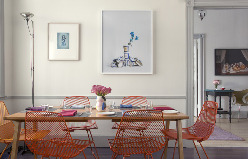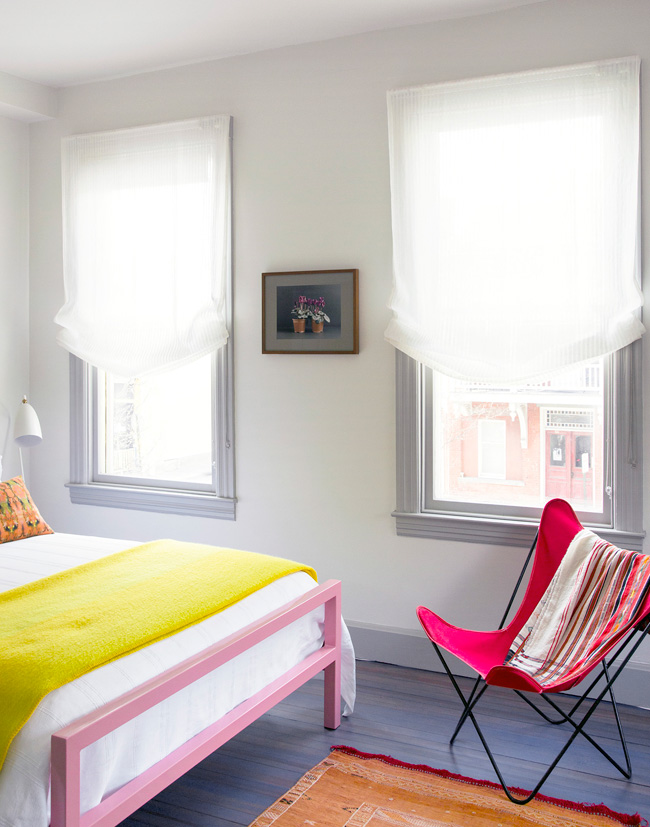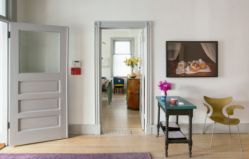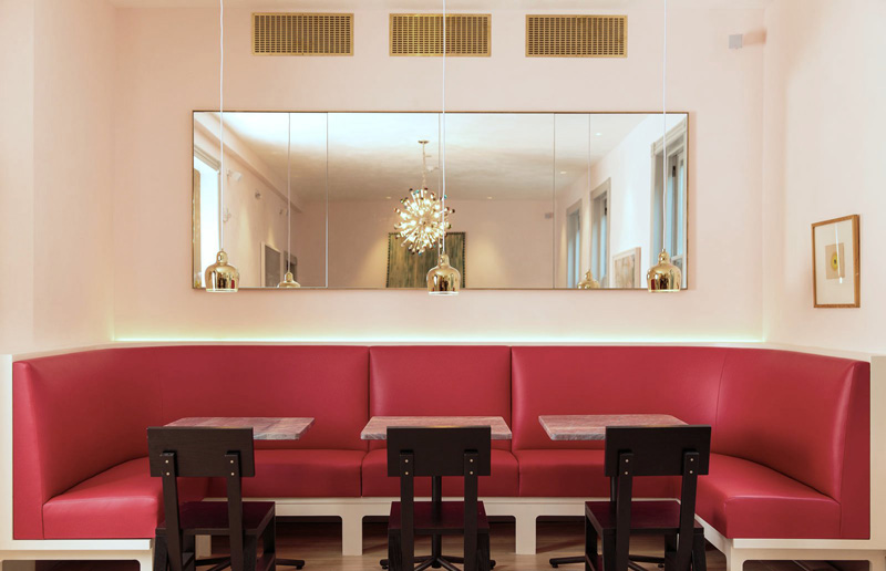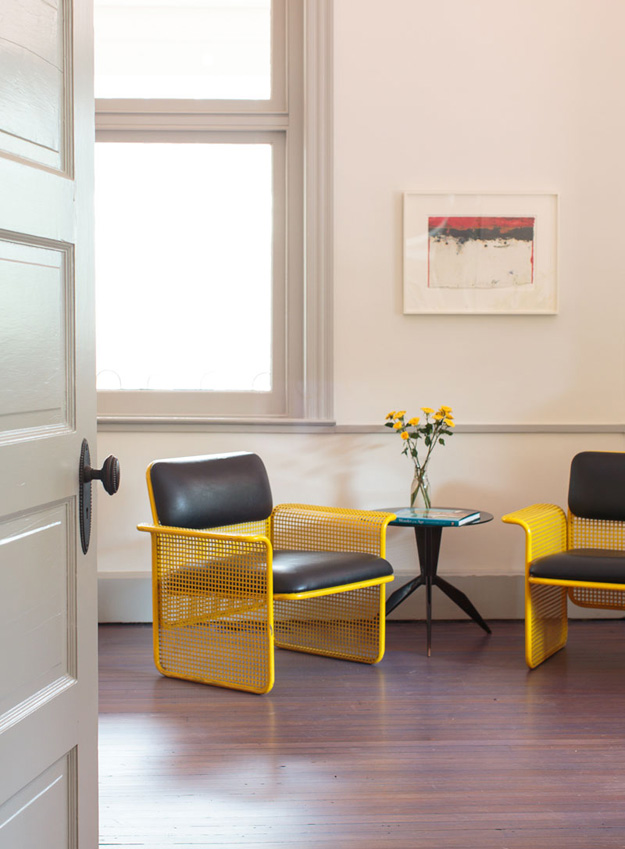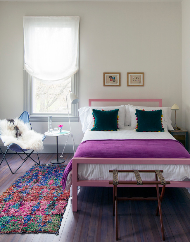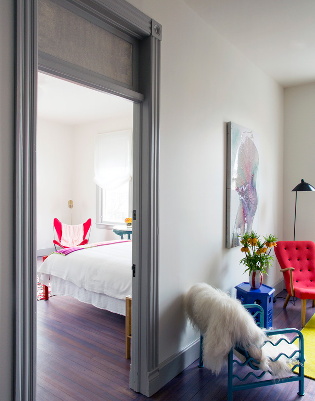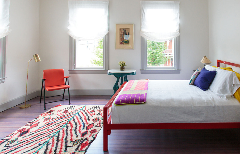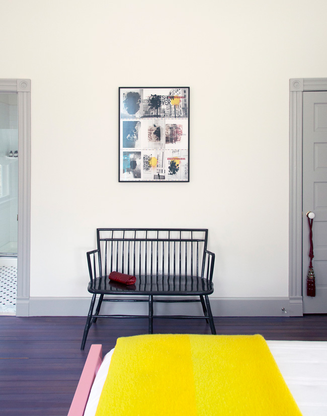 I need to take a trip to Tivoli, NY and stay in this fabulously decorated hotel. I adore the simplicity, playfulness, bold colours, quirky furniture and that grey trim everywhere!! Hotel Tivoli and its accompanying farm-to-table restaurant The Corner is a century-old building situated in the historic town of Tivoli, New York. Owned by painters Brice and Helen Marden, the property is filled with an eclectic collection of furniture, lighting and art. Reunion Goods & Services worked with the Mardens to infuse the space with lightness punctuated by individualistic moments. The design included a restaurant space with a custom marble bar, two dining rooms and ten unique guest rooms. The identity for the hotel and restaurant was a direct collaboration with Brice whose drawings are paired with reserved text evocative of gallery wall captions. This typography was carried throughout the space, with hand-painted numerals on doors and sparing use of color.