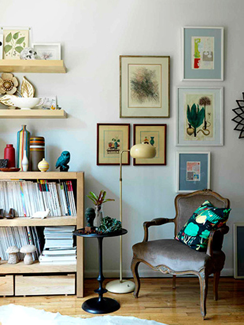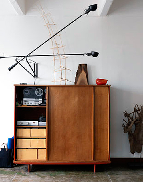 I adore this apartment. Designed by b-arch (Jo blogged this firm recently here and here), this was formerly the attic and kitchen spaces of an eighteenth-century building renovated to make an open-space loft. I love the stairs (although not to code by Canadian standards), the flat file cabinet, the globe collection, the huge sign in the kitchen, the LIGHT BLUE SMEG!!!, colourful tomato cans, Jielde light fixture (I have 2 of those!), huge vintage map as a headboard. And then there’s all the white…and those floors….