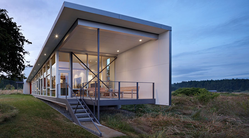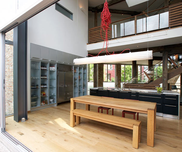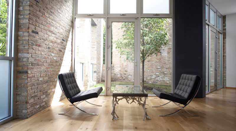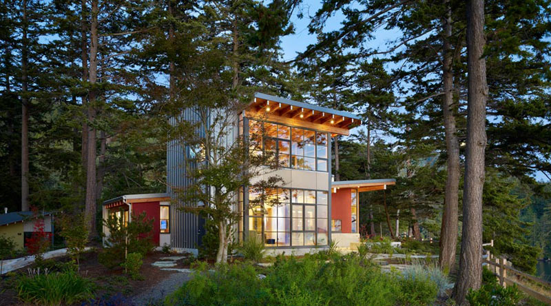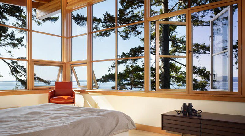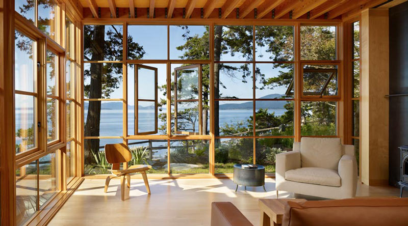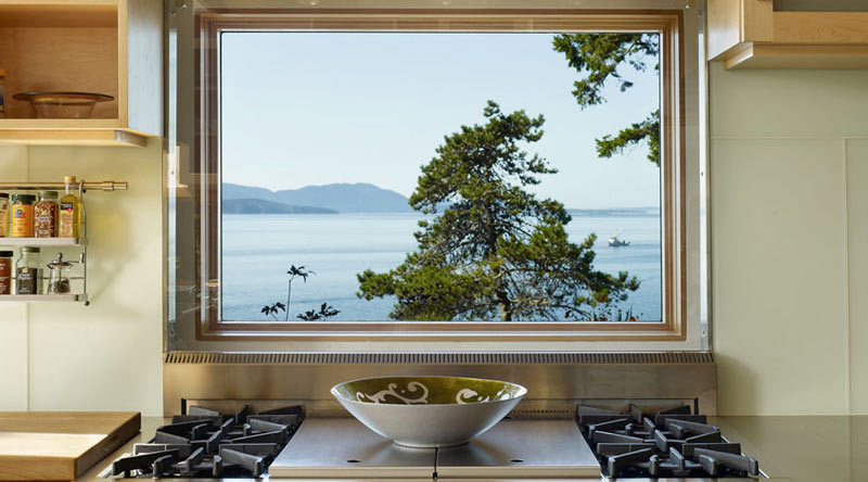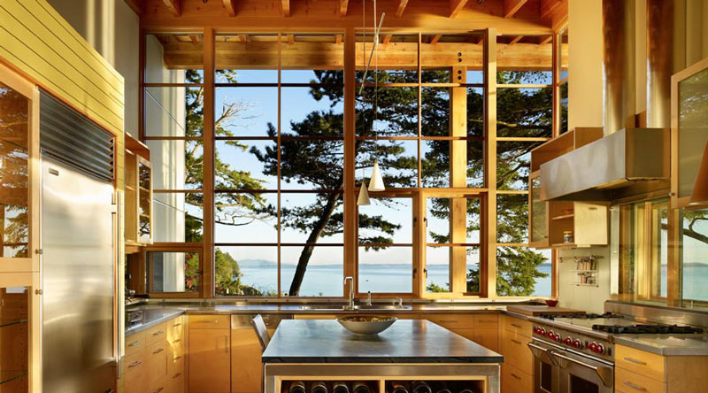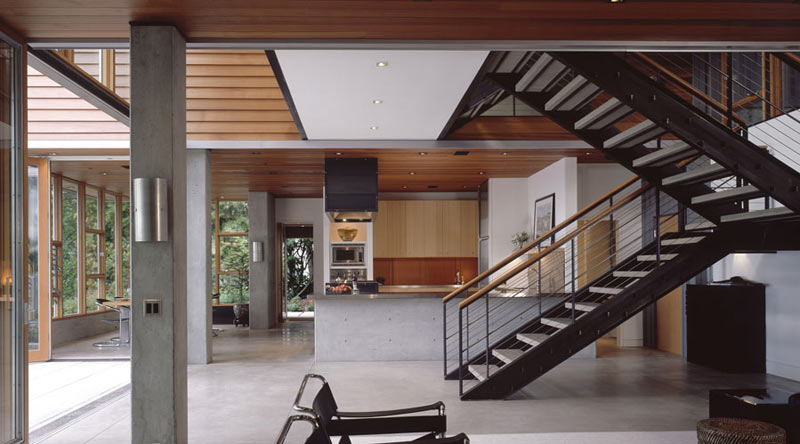 Talk about bringing the outside in! Architecture firm Miller Hull, based in Seattle and San Diego, have created homes that are a dream. Floor to cieling windows, a view over a stove, beautiful & slick modern kitchens, industrial flavoured bathroom, mix of rustic wood & concrete & exposed brick…and a bulldog on a couch….