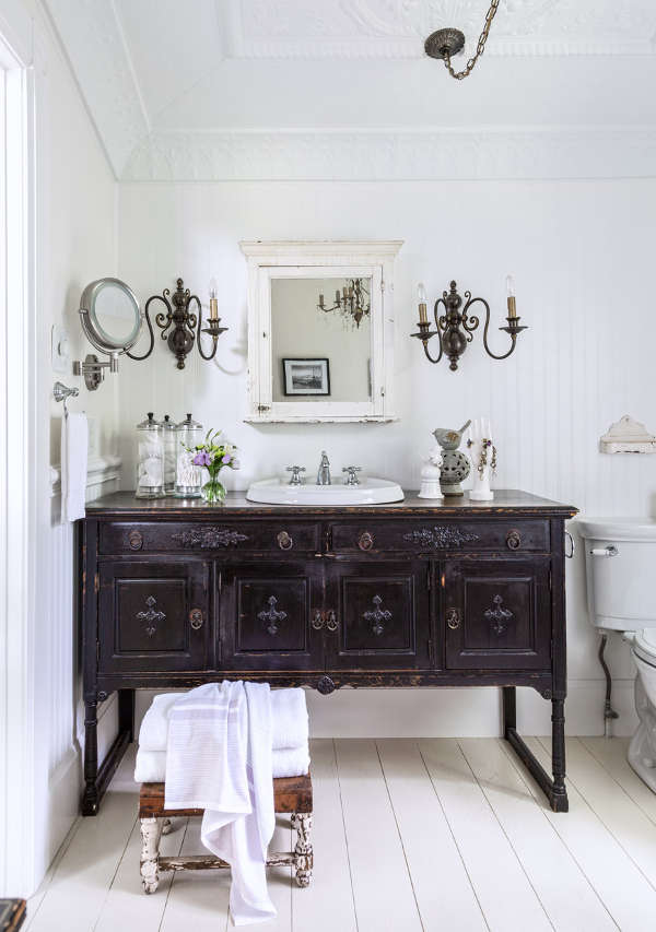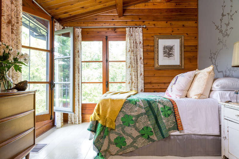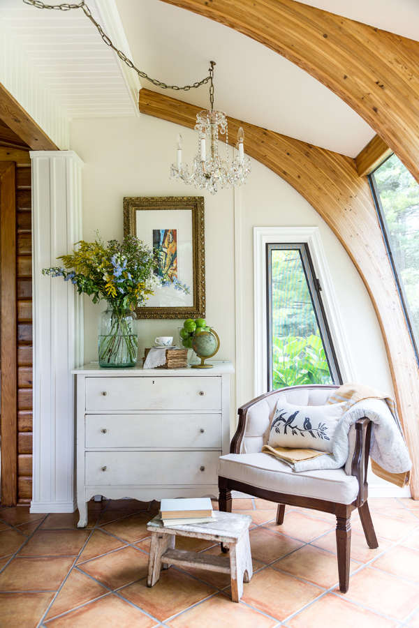 Whenever I’ve been asked what to do with ugly orange-stained knotty pine walls or ceilings I have always had one answer… paint them, paint it all! Sometimes you can’t. You could be renting, you might not have the money or the time to invest in such a big job. Then I came across this log cabin styled by Susan Burns and it was an epiphany. The knotty pine walls and ceilings are the perfect foil for the white furniture and soft furnishings. OK the brick fireplace and some of the floors have been painted but the often overpowering orange wood has definitely been softened by what I’m calling the “white within”. A pretty solution don’t you think?