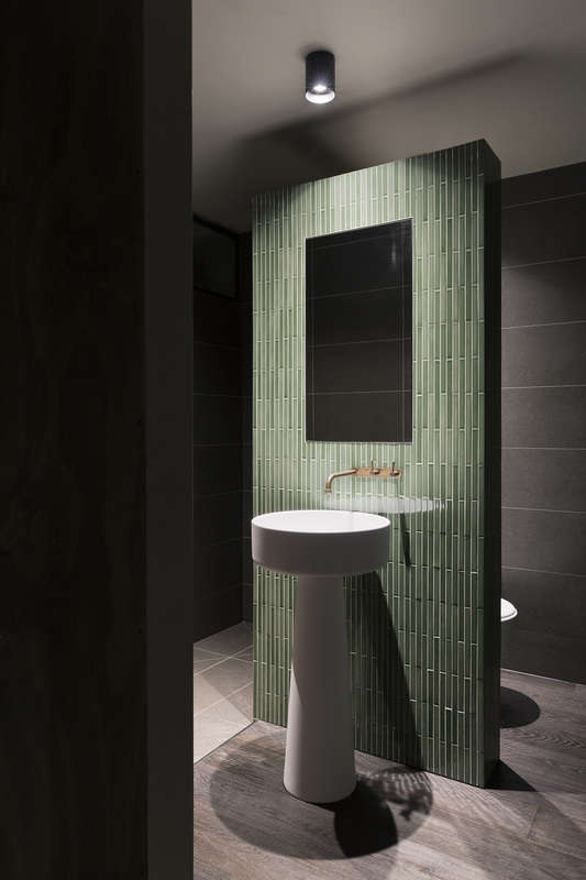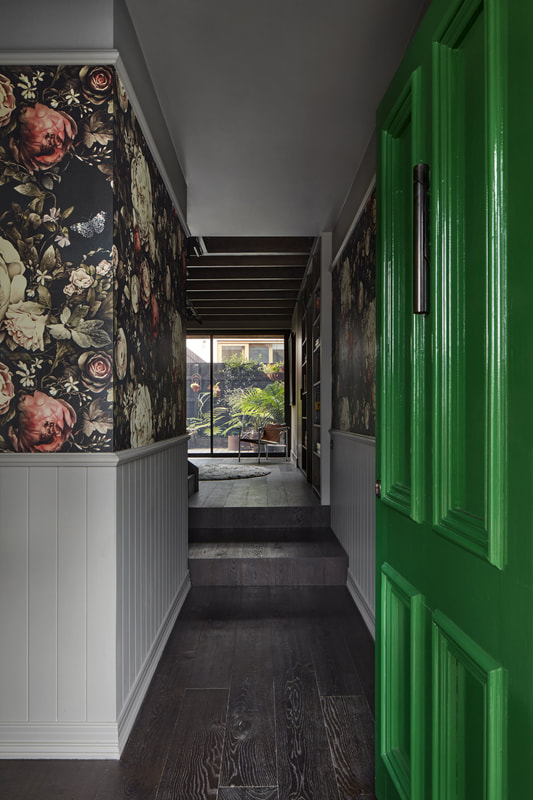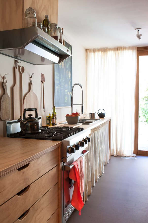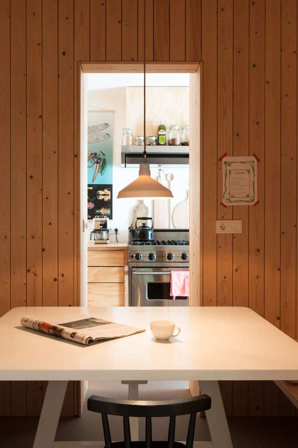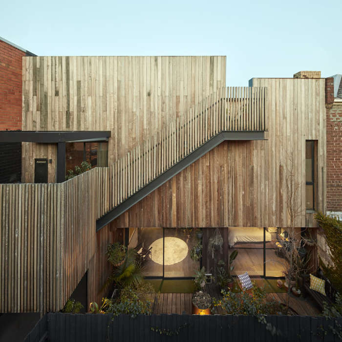 The 1850s timber house from had seen better days, its original features long stripped away. “The new addition is concealed using the same form/angle/dimension of the existing cottage, but where that is clad in traditional horizontal timber weatherboards, the new addition is clad in vertical ironbark shiplap. The 2 timber species are further contrasted by their treatment – traditional painted finish for the cottage whereas the ironbark will be left to weather off and soften in appearance. “ Inside large sliding walls of glass let in the light and provide easy access to the outside while the materials palette is of plywood, oak, steel, bluestone, brass and cement. Modern living in a strict heritage preservation area. Crisp House in the Melbourne suburb of Collingwood by Robert Nichol & Sons.