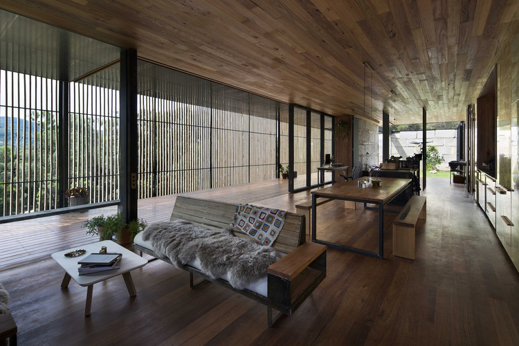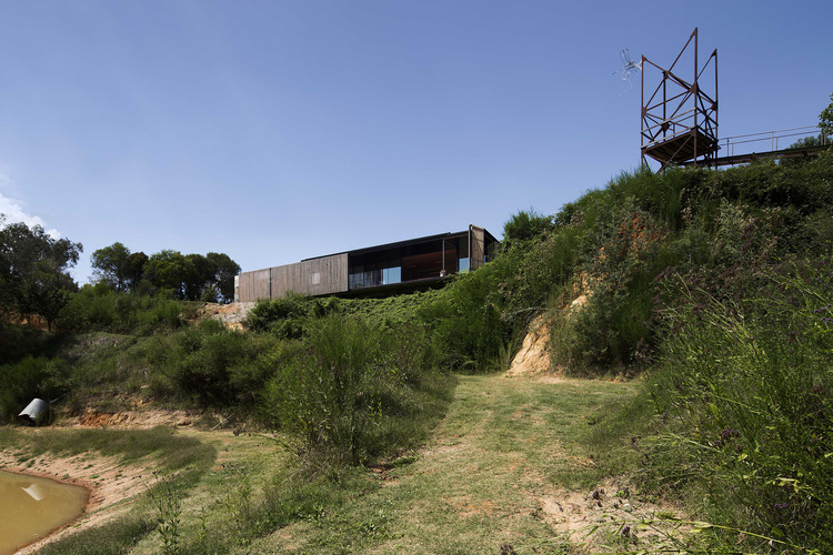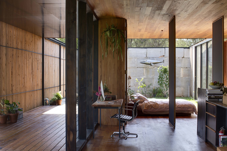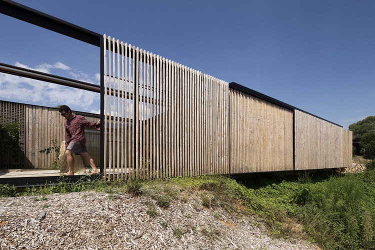 A collaboration between two brothers, one a sculptor, the other an architect, both with a passion for re-use and recycle. One tonne blocks of waste concrete anchor the building within the site, an old sawmill, and produce a patchwork of colour and texture. At 100sqm the house is not large but a series of moving walls and doors open the inside to the out expanding the visual boundaries of the rooms. Sawmill House by Archier.