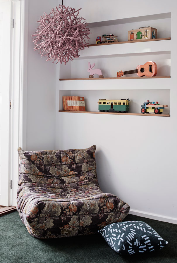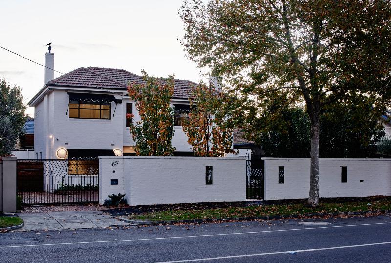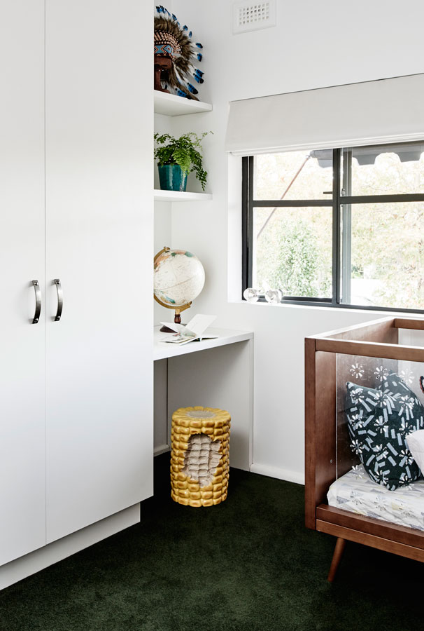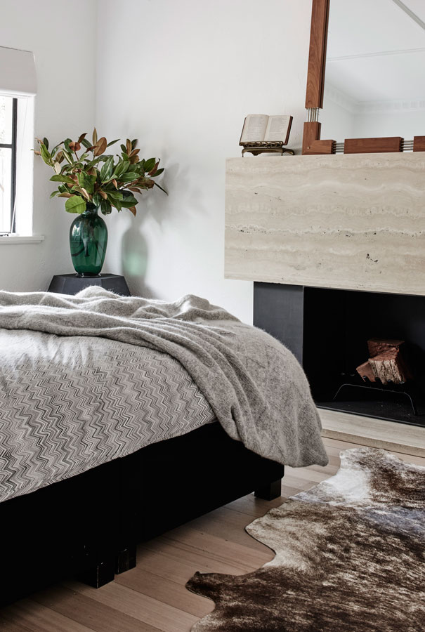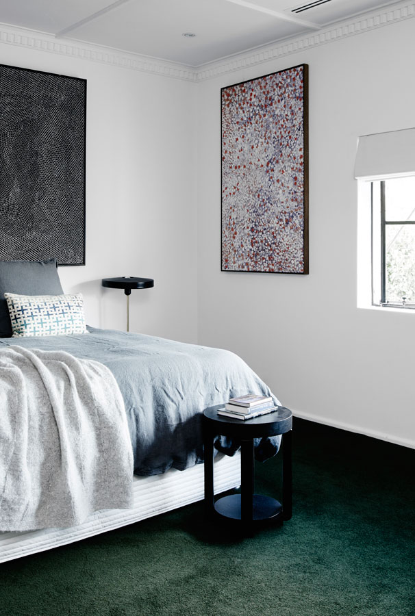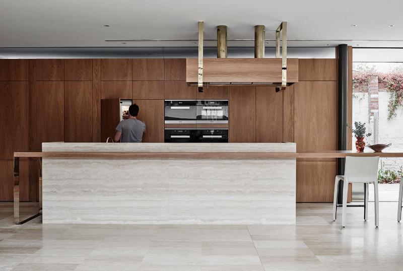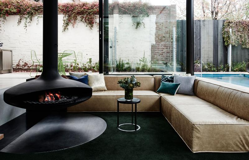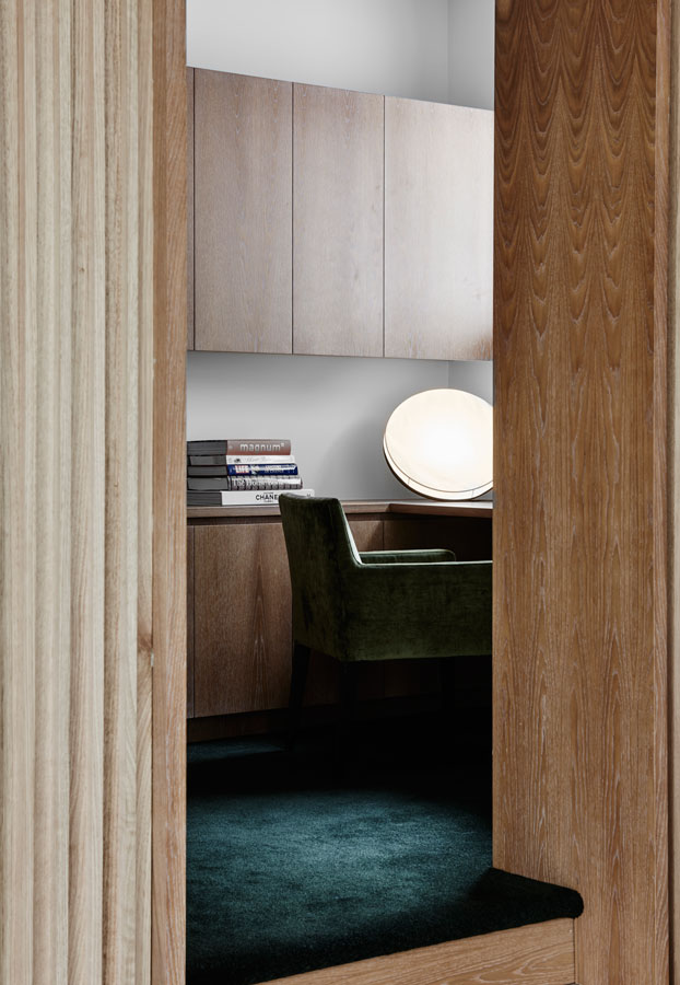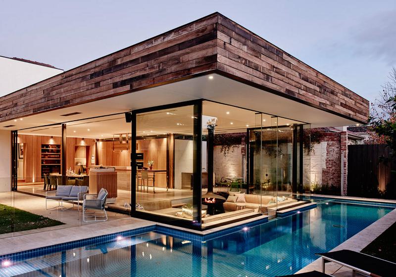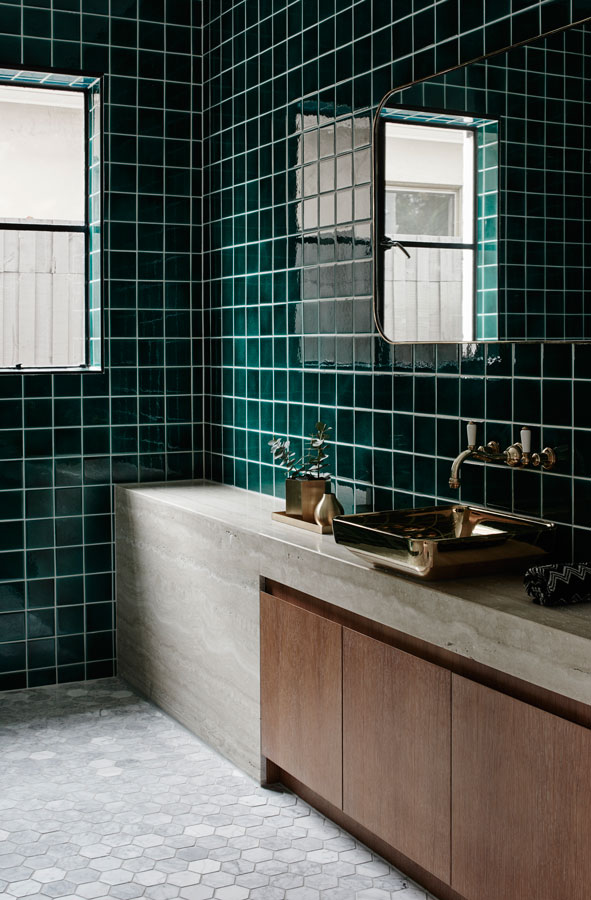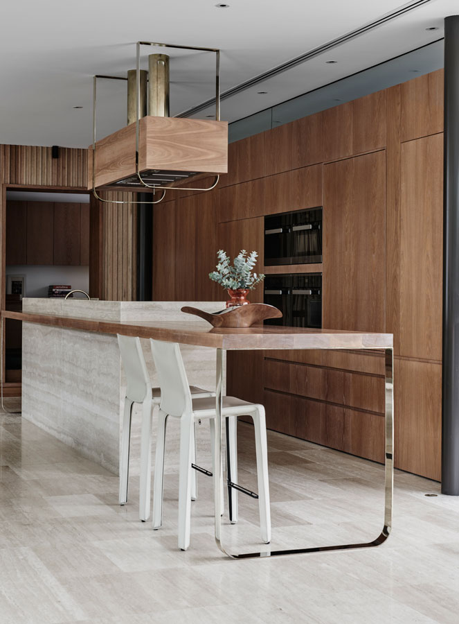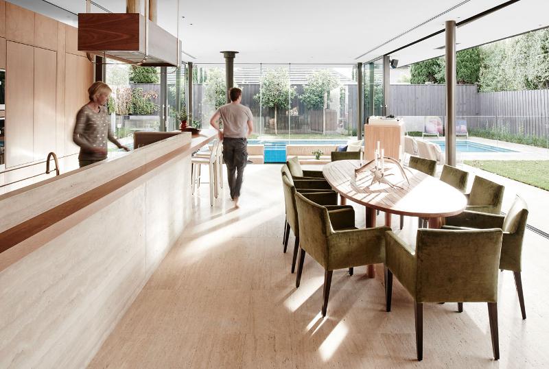 It’s not very often that I can feature a sunken lounge surrounded by a pool. It’s the centrepiece of a renovation and extension of a 2-storey Art Deco house by Melbourne’s Technē Architecture + Interior Design. The interior palette is predominantly neutral with a rich dark green playing off travertine, American oak, brass, leather and velvet. Luxury living with a nod to the house’s Art Deco roots and modernist playboy dreams.
