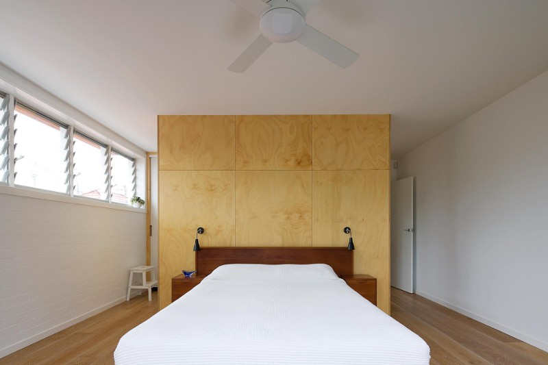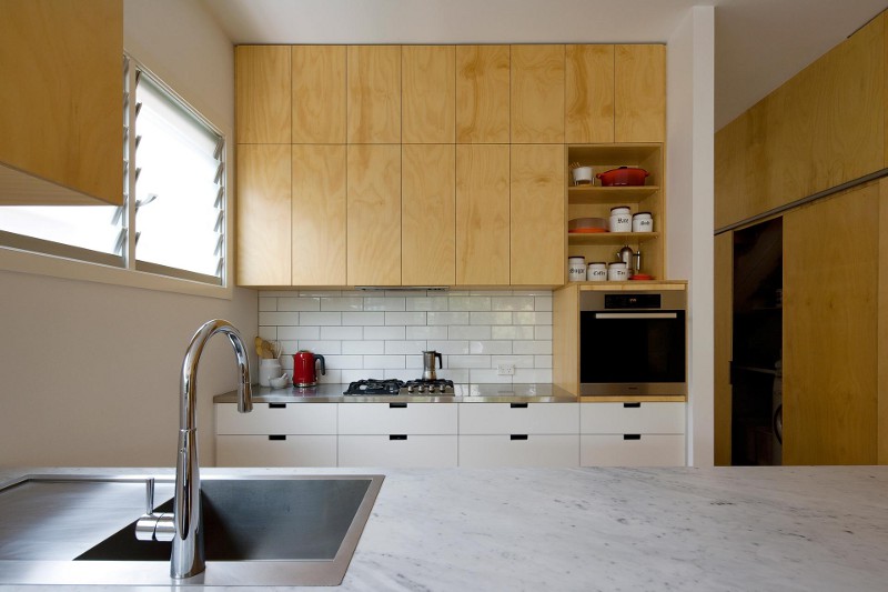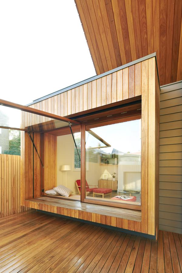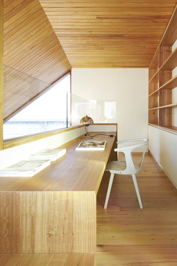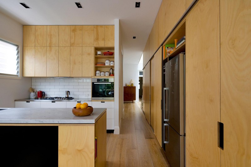 A modern 2 storey extension to a modest wooden cottage includes a new kitchen, dining area and master suite. The unusual shape allows for light to flood into the rooms while fitting neatly within the awkward suburban block. Concrete and white walls are warmed by the extensive use of timber. The heart of the home with a wooden heart. Fenwick by Julie Firkin Architects.