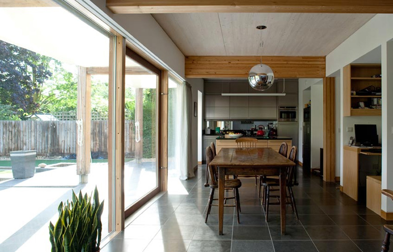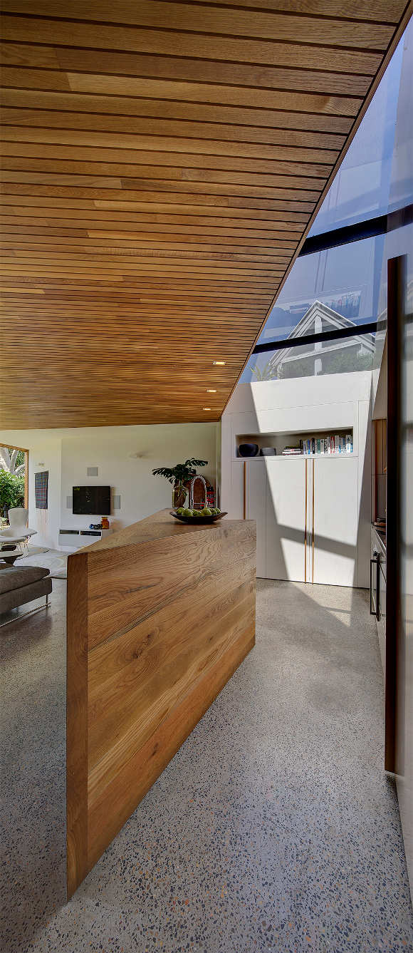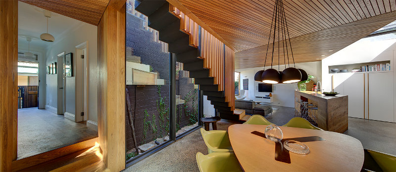 A small inner city block with existing worker’s cottage. How to increase the living areas on such a small footprint? By wrapping the extension around the house and borrowing space from both the inside and outside “rooms”, maximising volume and light. A beautiful palette of natural finishes, simple and textural. Clever use of space for an inner city family. The Balmain House by Fox Johnston.