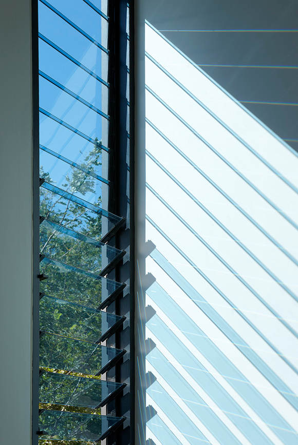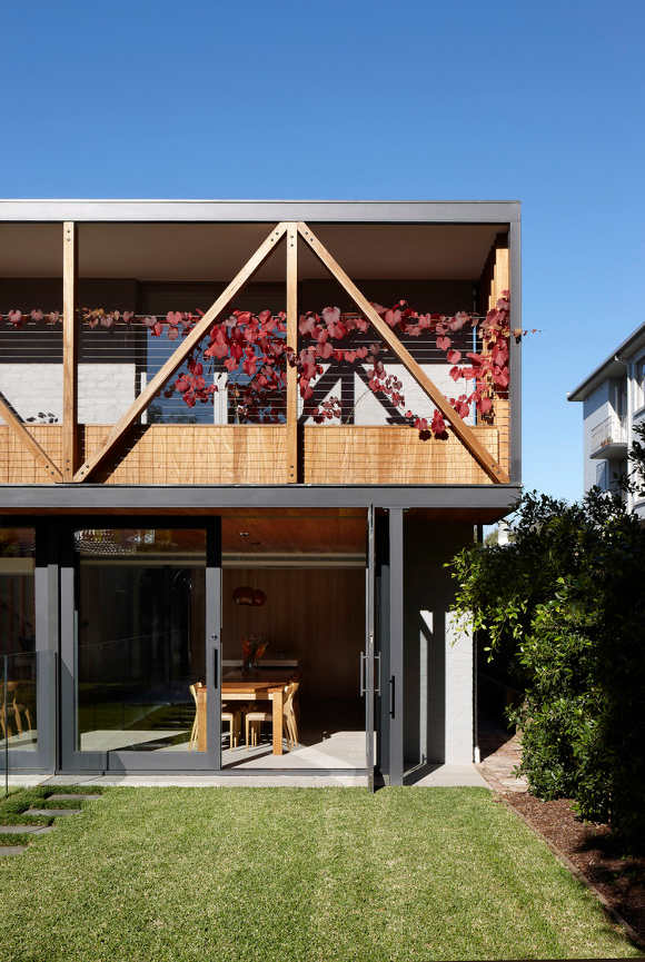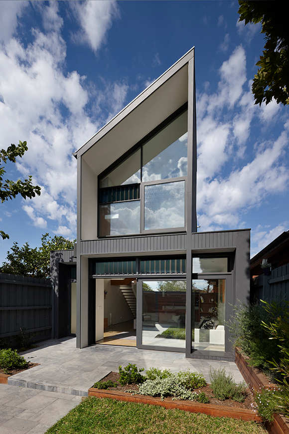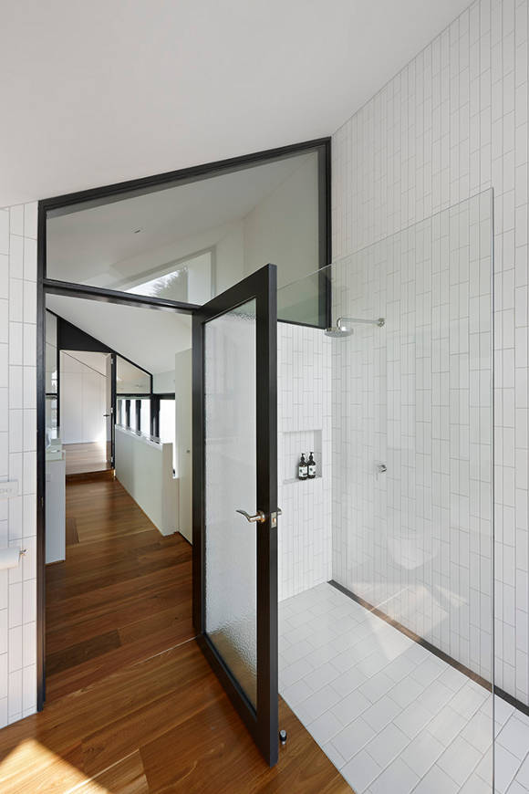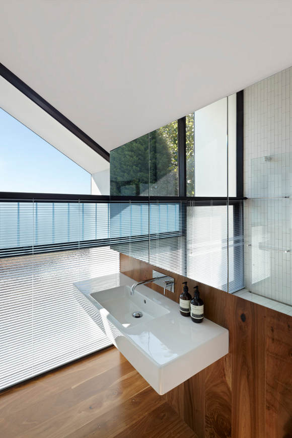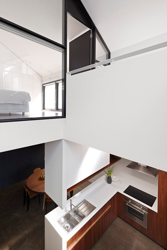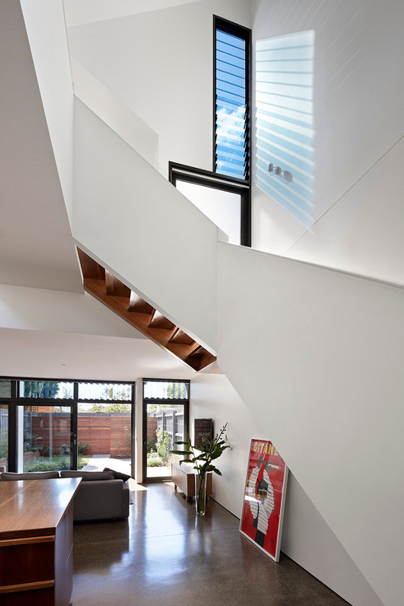 This North Fitzroy, Melbourne extension is unapologetically new. The original house is Edwardian era but the contemporary double height addition with an emphasis on glass allows the light to filter into the space, opening out and extending the spaces. (Love the ribbon of louvers that repeats around the house.) The loft bedroom looks down on kitchen, dining and living areas that focus on the rawness of the building materials to provide interest and stimulation. Unique, functional, elegantly spare. By AM. Architecture.