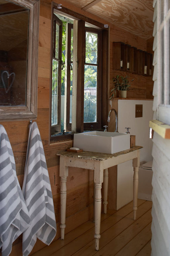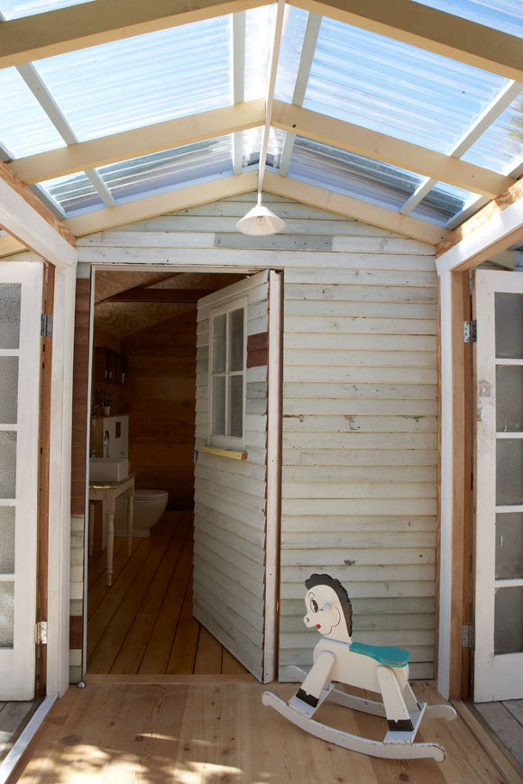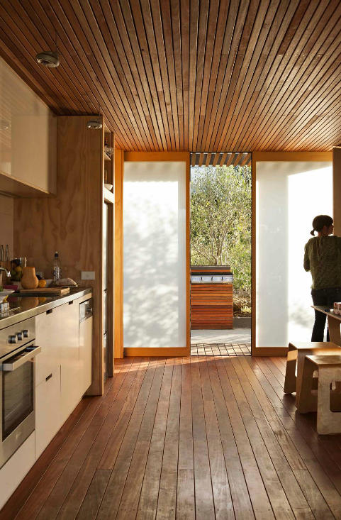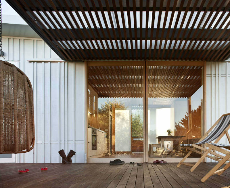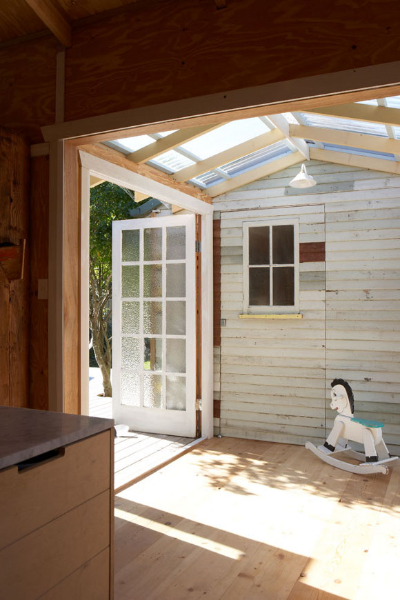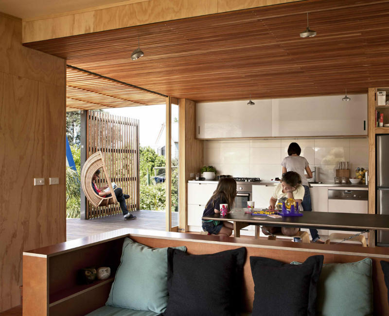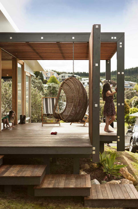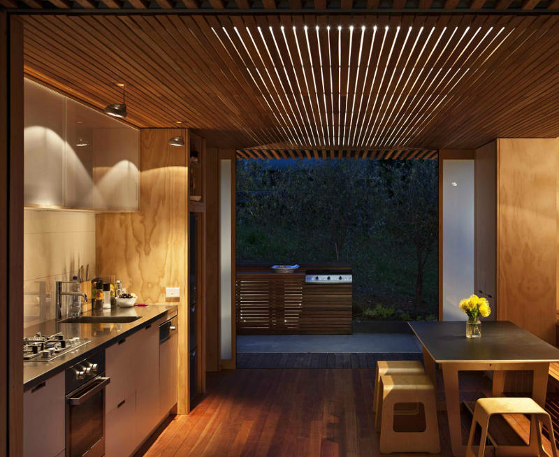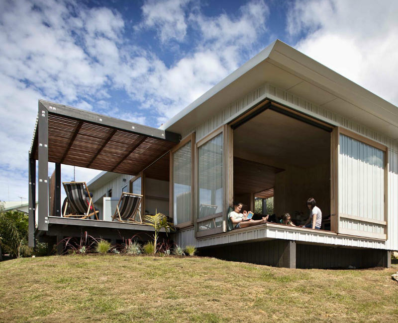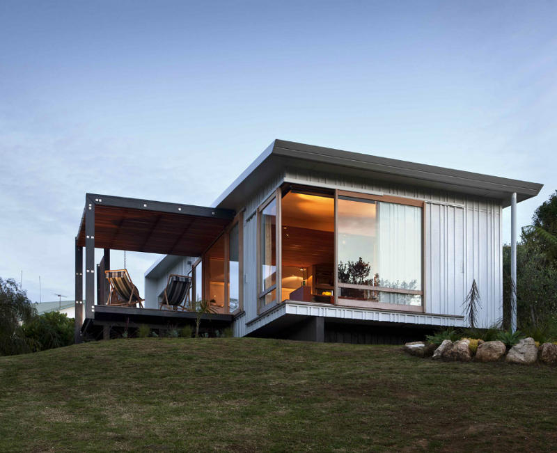 This family beach house in Onemana, New Zealand was a student project for 16 third-year architectural students, known collectively as Studio 19, at Unitec, overseen by Dave Strachan of Strachan Group Architects and Marshall Cook of Cook Sargisson & Pirie. The bach is home to four (mum, dada and 2 girls) and provides master bedroom, bunkroom, bathroom, kitchen, living and dining as well as decks to extend the living spaces outwards. It’s not elaborate or pretentious but harks back to the days of simple family holidays while still being stylish on a low budget. The bach was built on campus forming part of the end-of-year grad show before being transported to its final site.