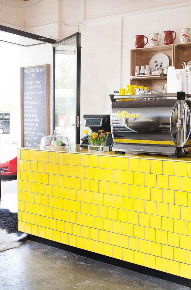 OK. OK. It’s a produce store, coffee stop, sandwich purveyor (sister store to Pope Joan) and not a domestic interior but look at it. It’s yellow. I’m still on my colour campaign as you can see. Besides I’ve always had a fantasy about living in a coffee shop. All that caffeine on hand! Hams and Bacon by Figureground.