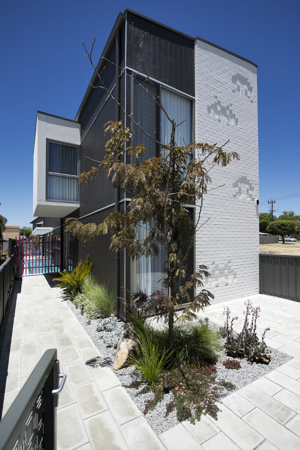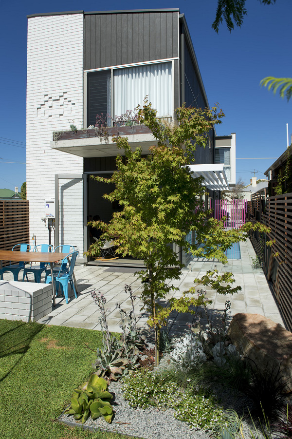 How cool! I already love the modern open plan, the concrete and the white brick, the bright yellow and hot pink accents as well as the pool but what I really, really love are the Space Invader motifs in the brickwork. Crass? No way! Life is too short not to have a sense of humour. Florence House by Perth, West Australia based Klopper & Davis Architects.